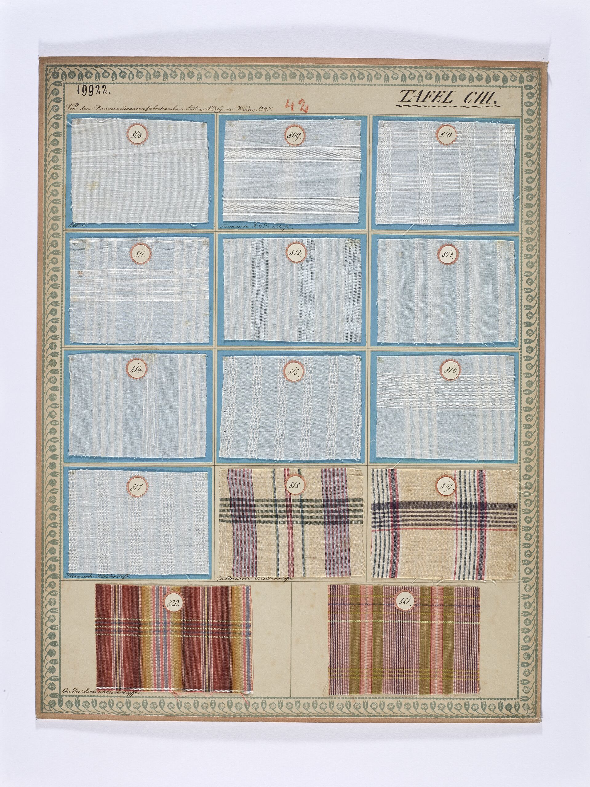 - Beschriftung (Vorderseite) : Von dem Baumwollwaarenfabrikanten Anton Holy in Wien, 1827. / Wallis; Façonnirte Kleiderstoffe; Quadrillirte Kleiderstoffe.