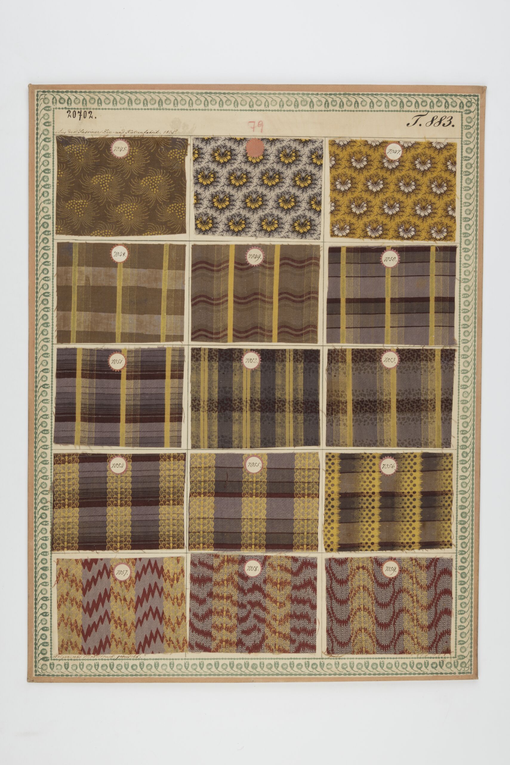 - Beschriftung (Vorderseite) : Aus der Sassiner Ziz- und Kattunfabrik, 1825. / Walzen- und Modeldruck, gemischt.