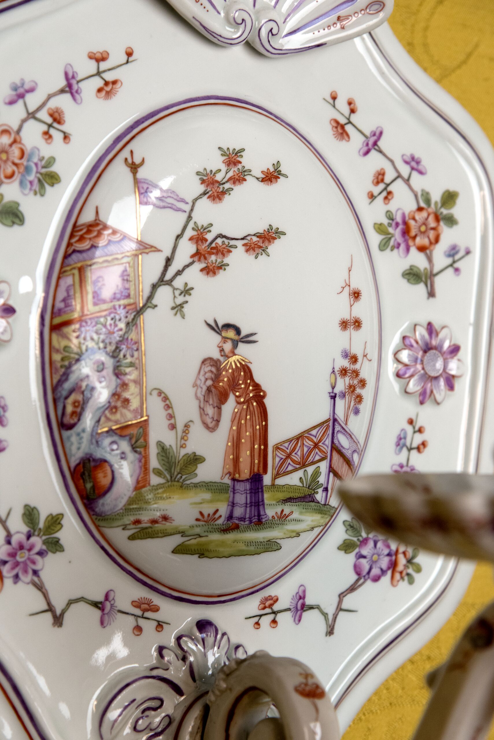 Das Mittelmedaillon jedes einzelnen der zwölf Wandleuchter ziert eine andere der bunt gemalten Chinoiserien, die für Wien besonders kennzeichnend sind. Hayward führt sie auf Vorlagen von Stalker zurück. Für Mrazek sind sie „in ihrer Art der originellste Beitrag der Wiener Manufaktur zu dem von der Barockzeit so sehr geliebten Thema der Chinoiserie.“