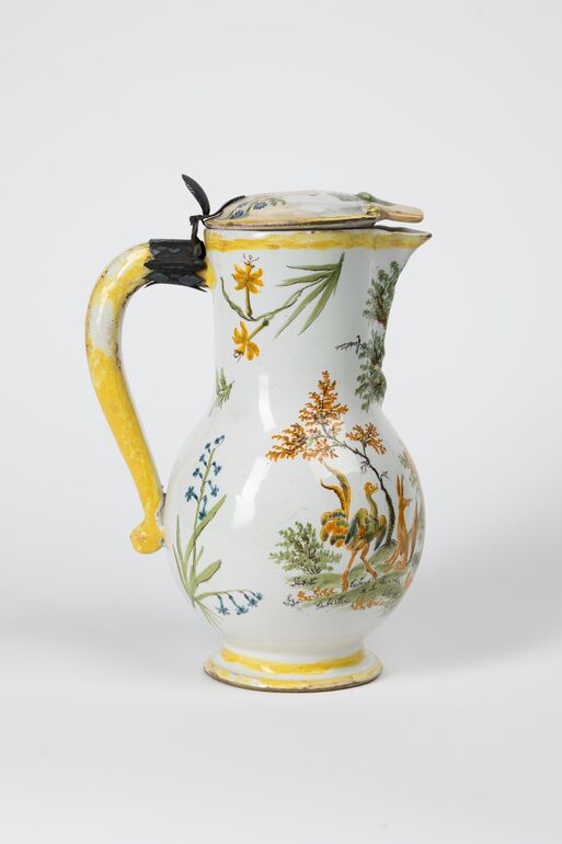 halbe Kannenform, mit Blaudekor. Rankenwerk, Blattwerk und Girlanden. Am Ausguß Maskeron, am Deckel Zinnengestalt als Knauf