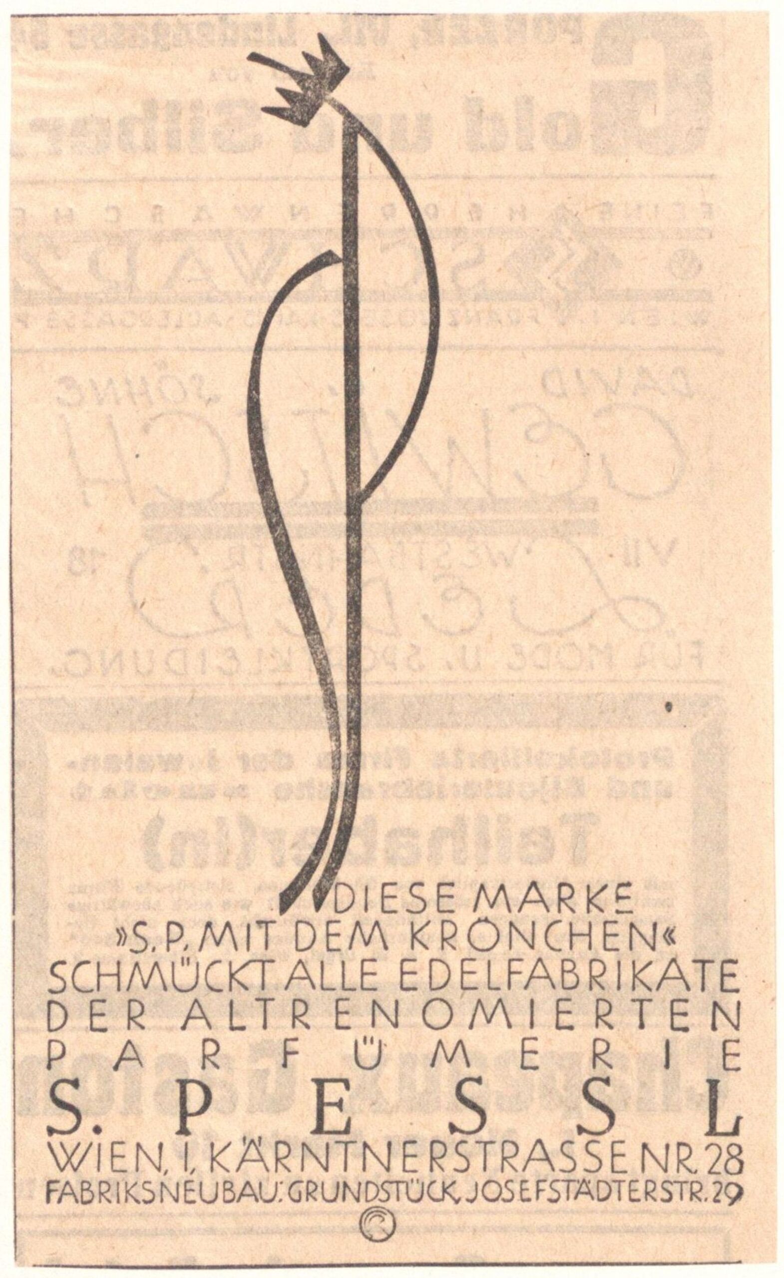 - Text am Objekt: SP [monogr.] / Diese Marke / "S. P. mit dem Krönchen" / schmückt alle Edelfabrikate / der altrenomierten / Parfümerie / S. Pressl / Wien. I. Kärntnerstrasse Nr. 28 / Fabriksneubau: Grundstück, Josefstädterstr. 29
