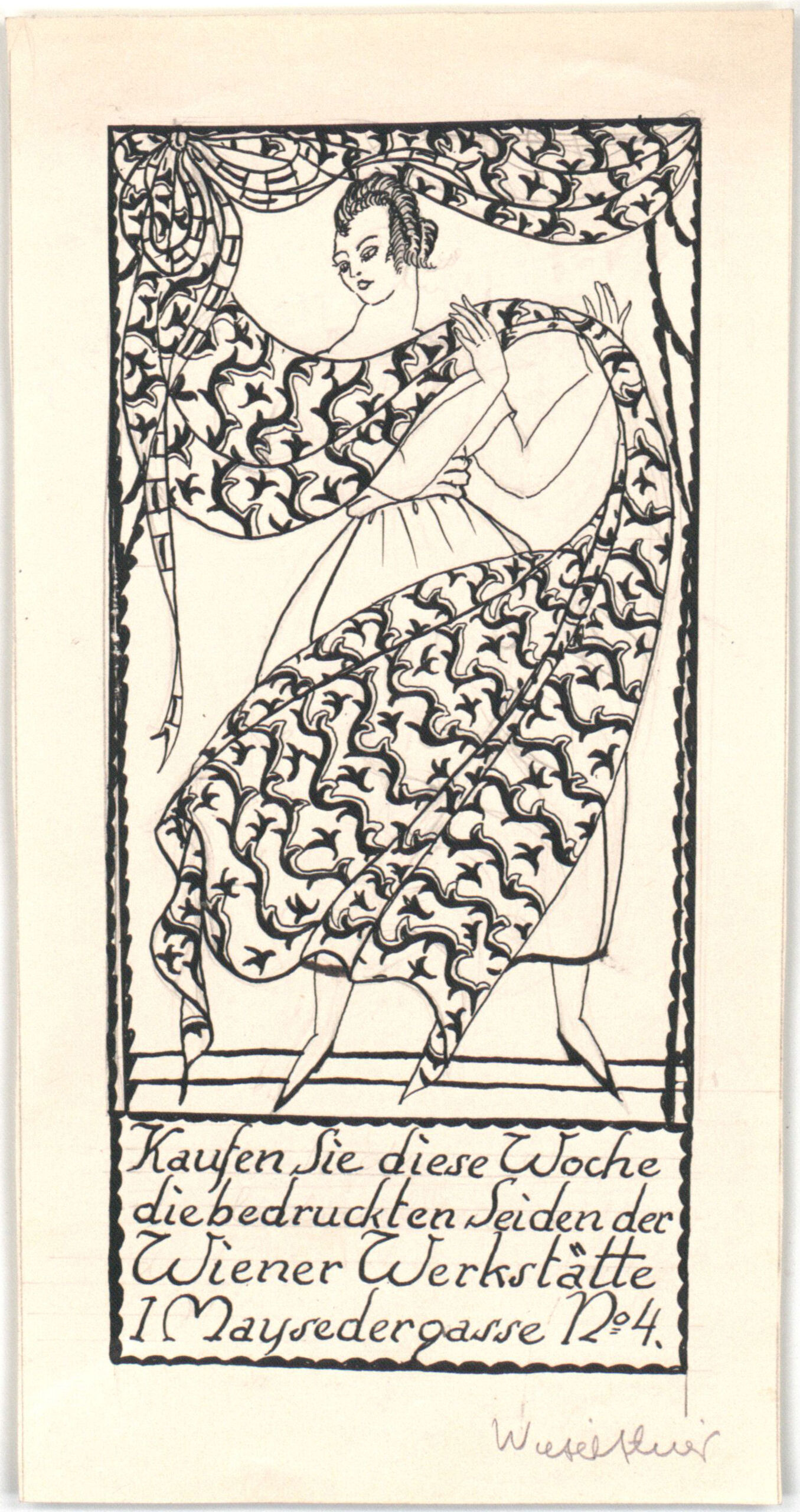 - Werbung "Kaufen Sie diese Woche die bedruckten Seiden der Wiener Werkstätte I Maysedergasse No 4" (Originaltitel)