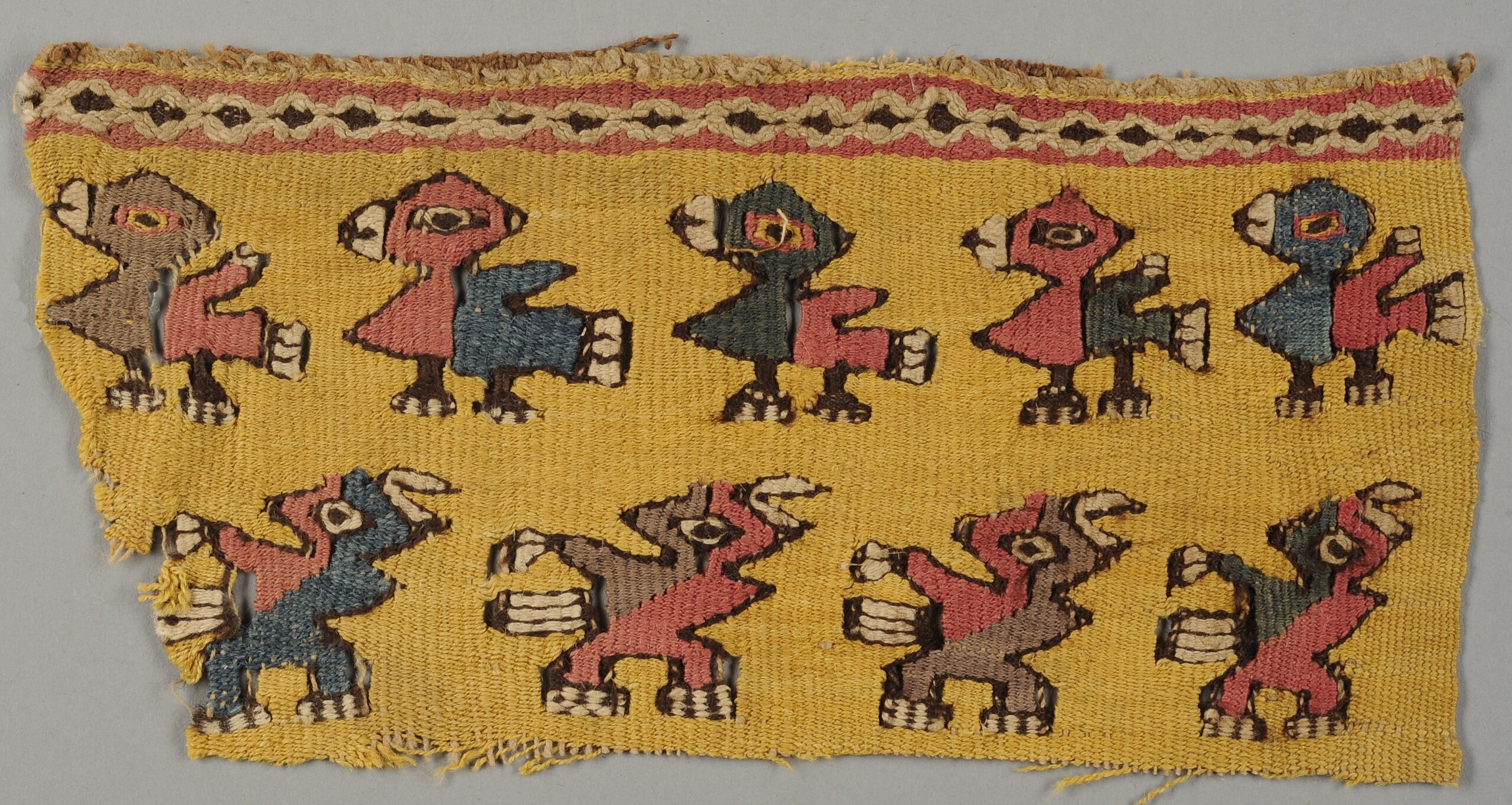 - Wirkereifragment mit bunten Vögeln auf gelben Grund (deskriptiver Titel)