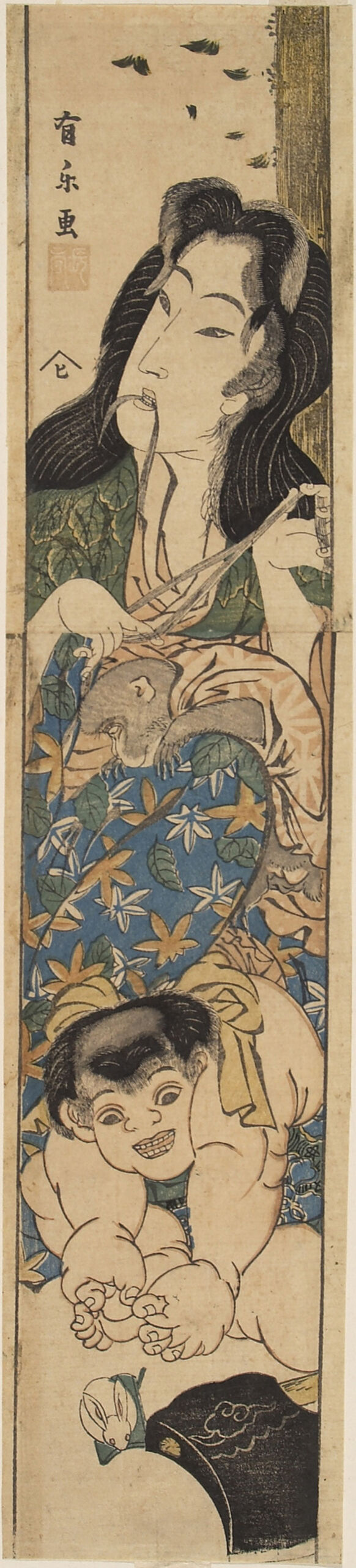 Yamauba 山姥 mit einem Affen auf dem Schoß. Unten Kintoki 金時 mit seiner Axt.