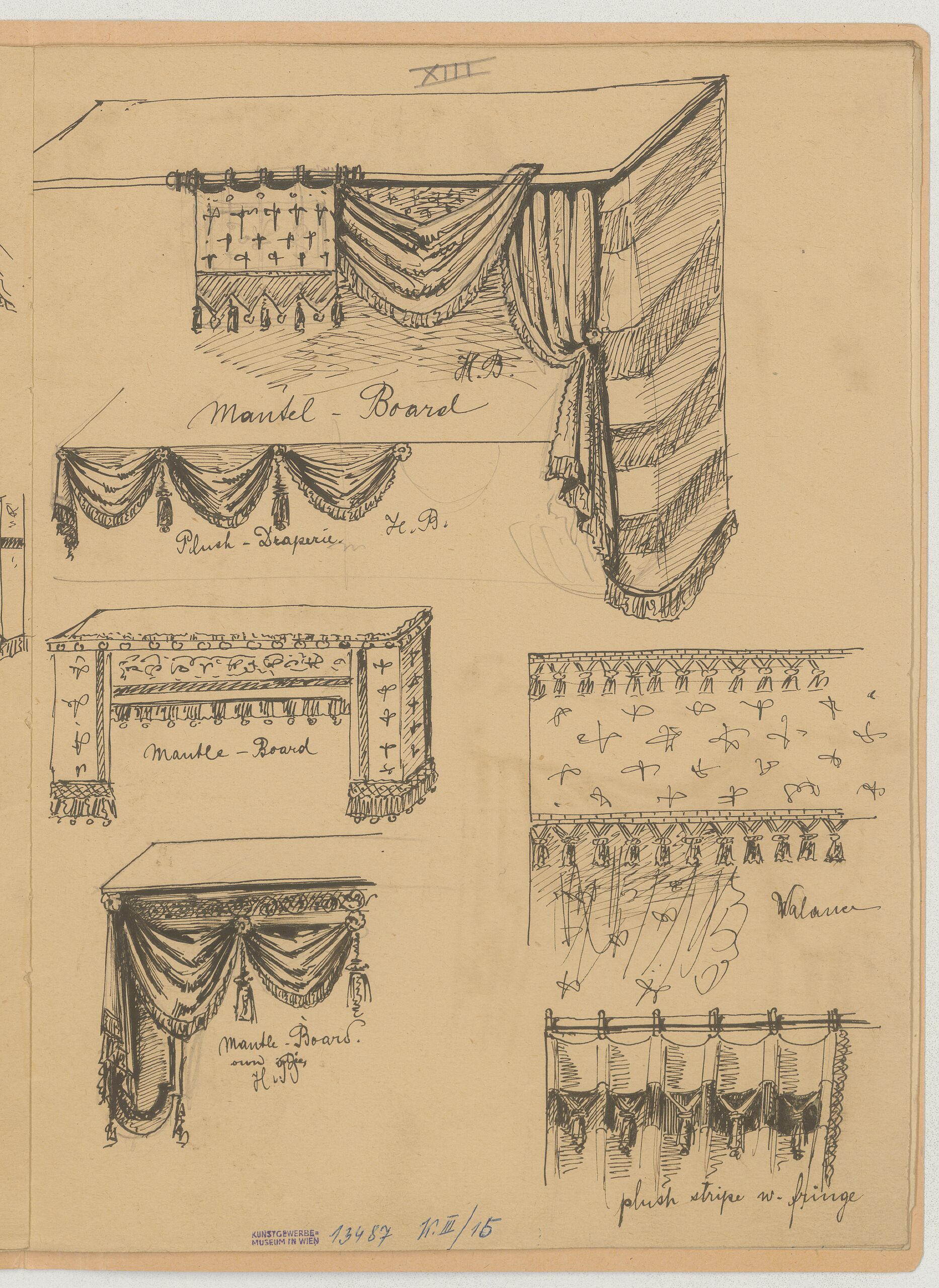 Entwurf, Zeichnung mit mehreren, teils skizzierten Entwürfen für Lambrequins und Vorhangdraperien, Heinrich Hof-Tapezierer Backé, MAK Inv.nr. KI 13487-11-3-15