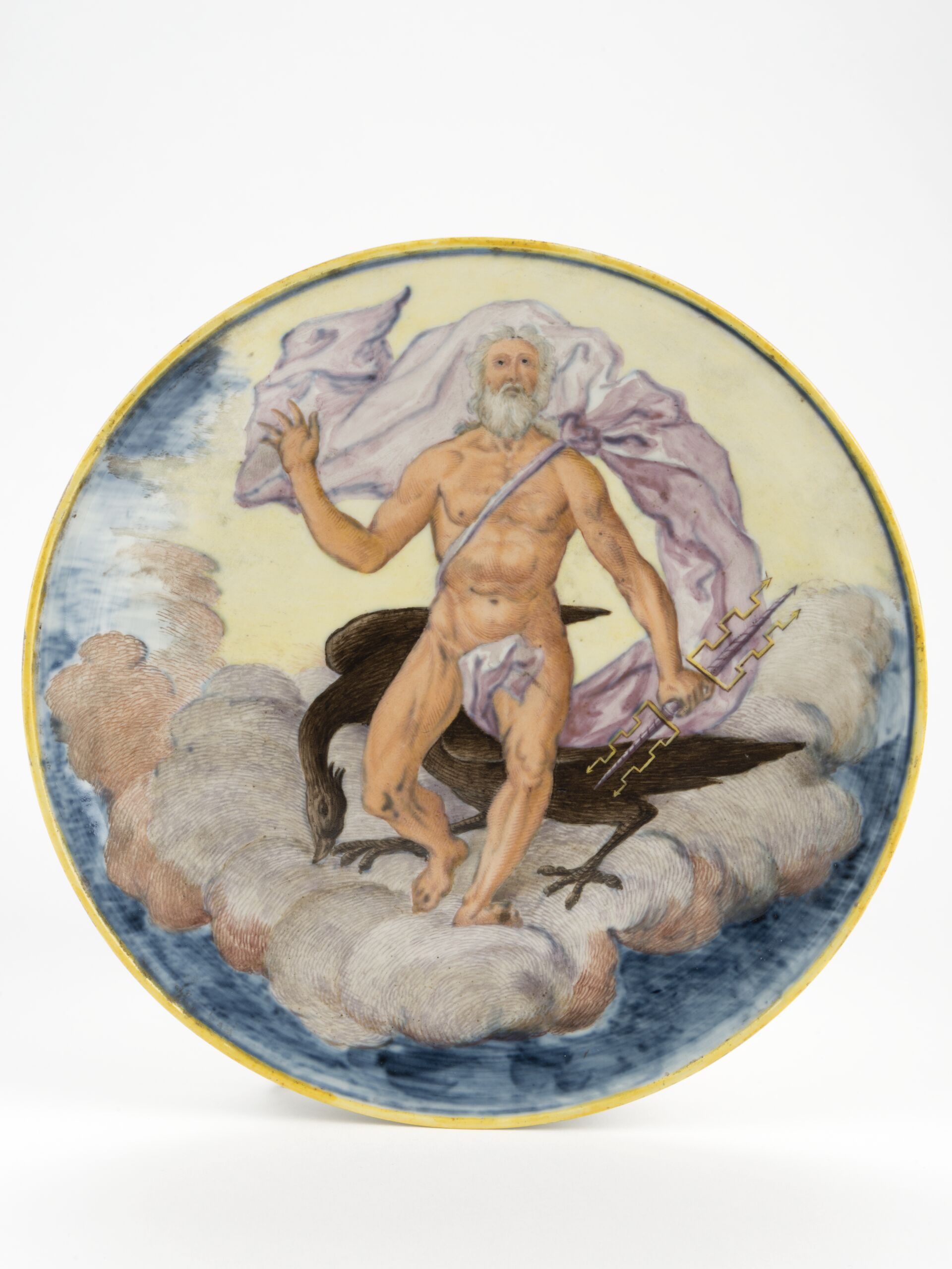 Teller mit farbigem Dekor nach Majolika-Art, Zeus auf einer Wolke stehend mit Geier