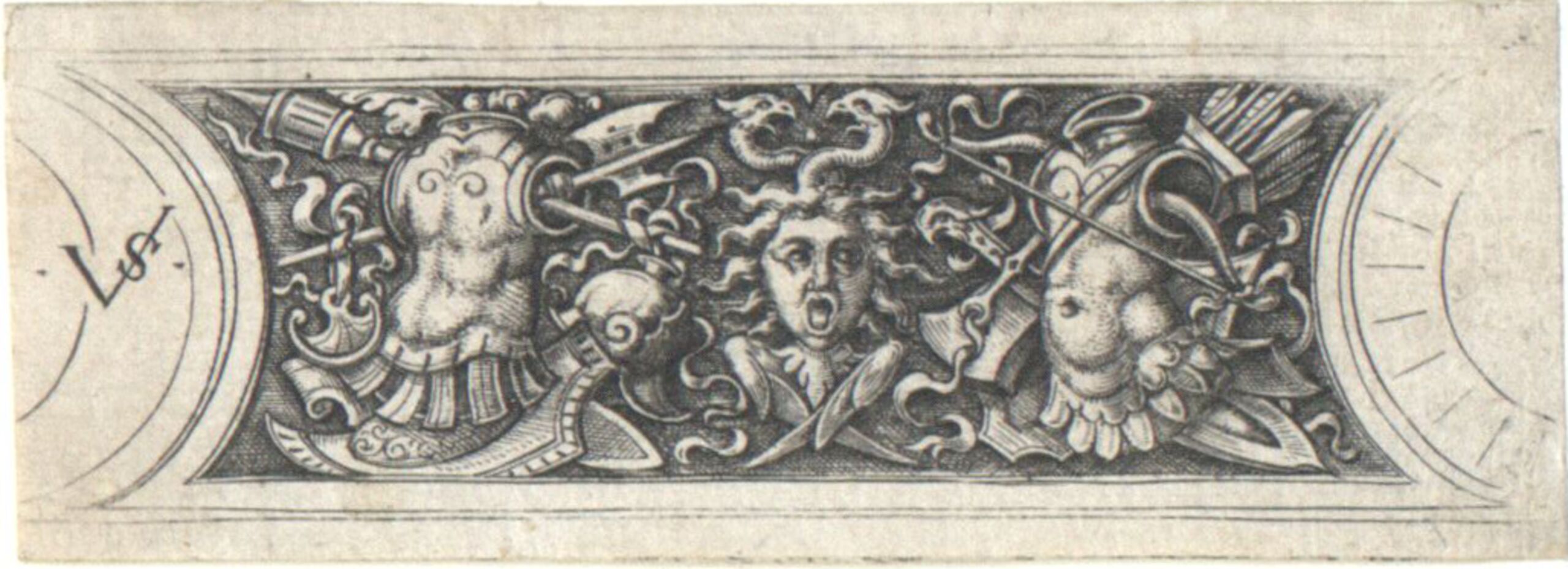 Ornamentstich, Zierbeschlag mit zwei Waffentrophäen, in der Mitte das Medusenhaupt, Virgil Solis, MAK Inv.nr. KI 6358