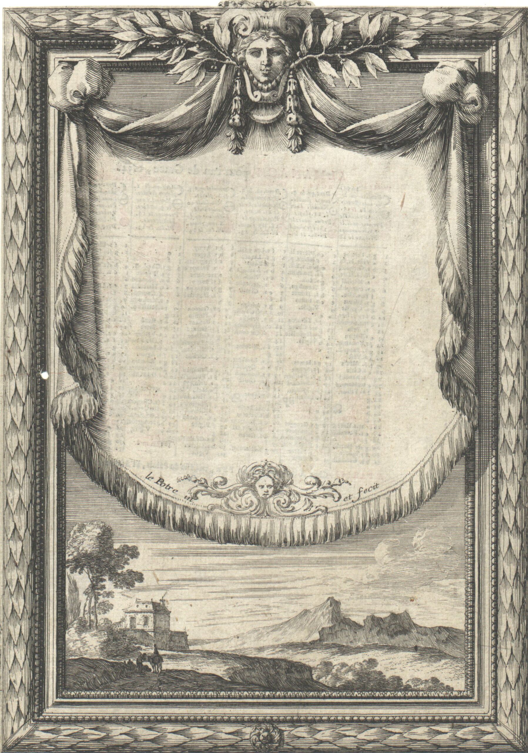 Ornamentstich, Zierrahmen mit Landschaft, auf der Rückseite Almanach pour l’ an 1654, Jean Lepautre, MAK Inv.nr. KI 1-658-655