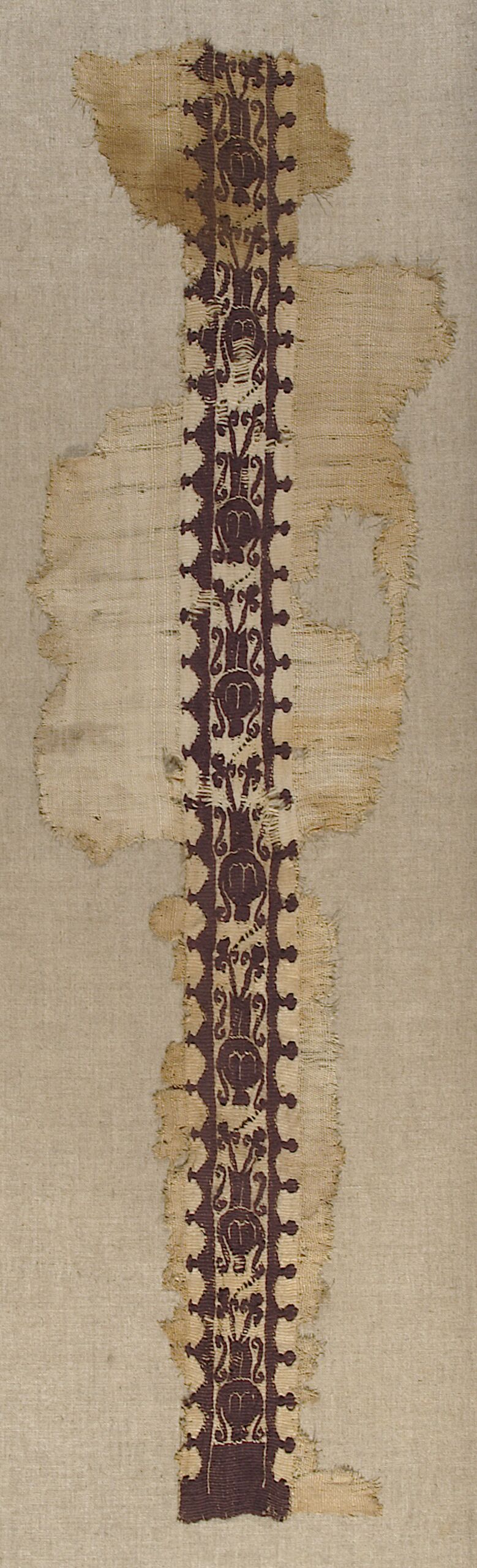 • Gewebefragment, Zierstreifen mit Geweberest; gereihte Vasen mit Dreiblättern, Anonym, MAK Inv.nr. T 613