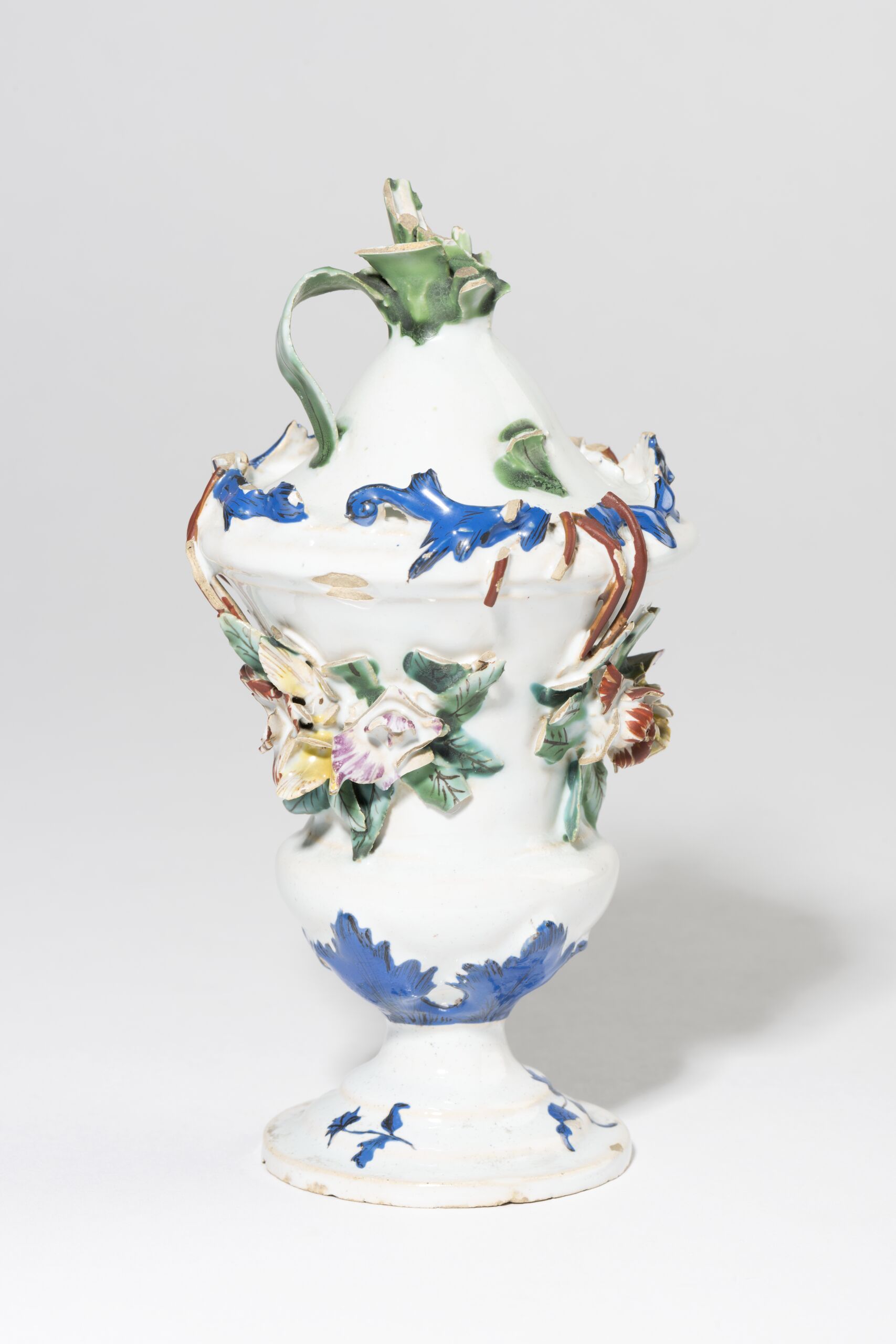 Vase einer Tafeldekoration mit bunten Reliefgirlanden, blauen Reliefvoluten, Akanthusblättern, am Fuß kleine blaue Zweige