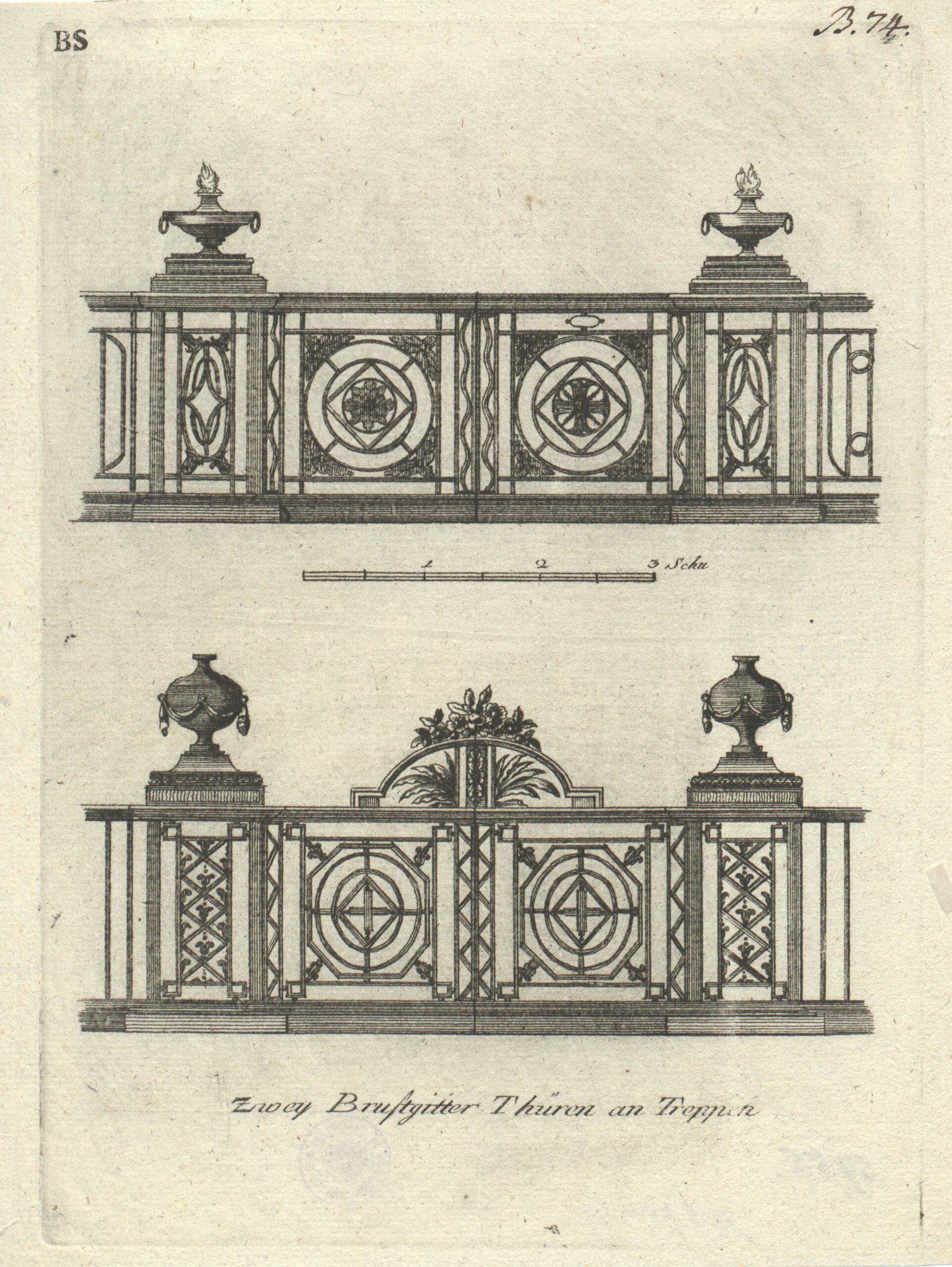 - Zwei Brüstungen, bezeichnet „Zwey Brustgitter Thüren an Treppen“, Blatt 4 aus einer Folge von Schlosserarbeiten, herausgegeben von Fietta et Comp. (vom Bearbeiter vergebener Titel)