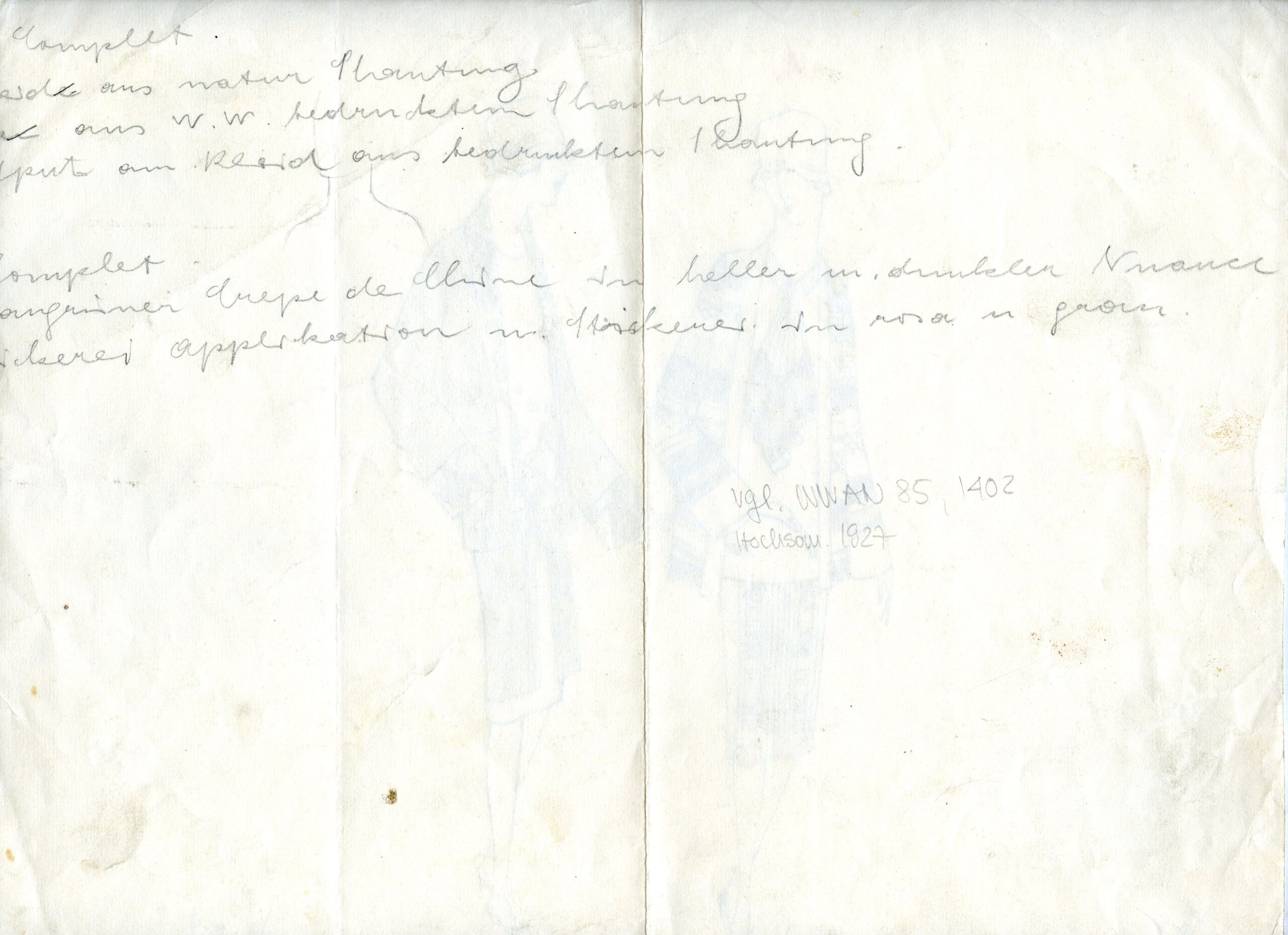 - Text am Objekt: Rhein Westf.[rückseitig:] Complet / [...] aus natur Shantung / [...] aus WW bedrucktem Shantung / [...] am Kleid aus bedrucktem Shantung / Complet / graugrüner Crepe de Chine in heller und dunkler Nuance / Stickerei Applikation u. Stickerei in rosa u. grau