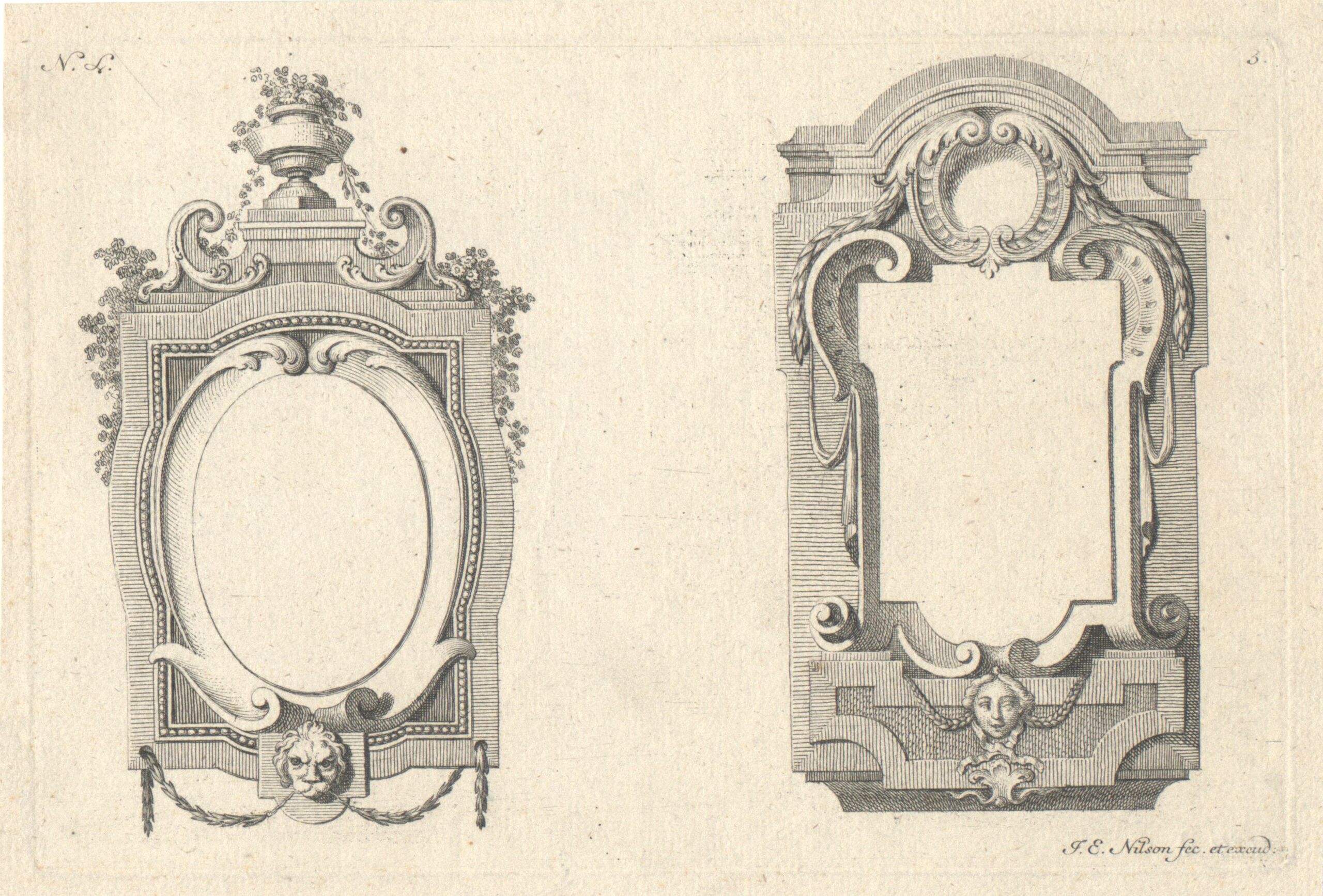 - Zwei Kartuschen mit Festons, Blatt 3 aus der Folge „Architectische Laubwercke nach heutiger Art“, herausgegeben von J. E. Nilson, Verlagsnummer L (50. Folge des von Nilson verlegten Reihenwerks mit 69 Folgen) (vom Bearbeiter vergebener Titel)