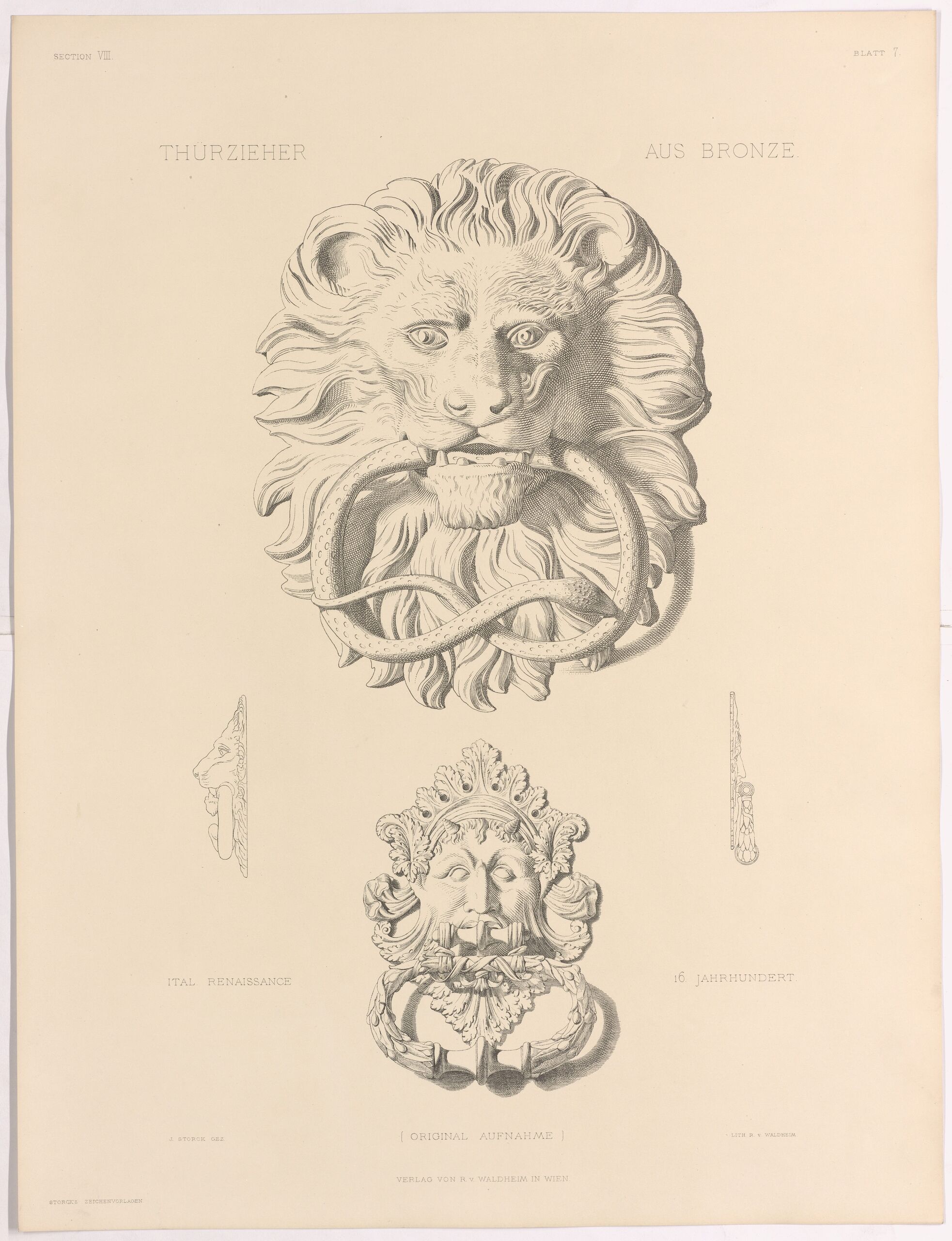 - Text am Objekt: SECTION VIII; BLATT 7; THÜRZIEHER AUS BRONZE.; ITALI. RENAISSANCE. 16. JAHRHUNDERT.; (ORIGINAL AUFNAHME); J. STORCK GEZ.; LITH. R. V. WALDHEIM; ORIGINAL-COMPOSITION VON PROF. STORCK.; VERLAG VON R. V. WALDHEIM; STORCK'S ZEICHENVORLAGEN.