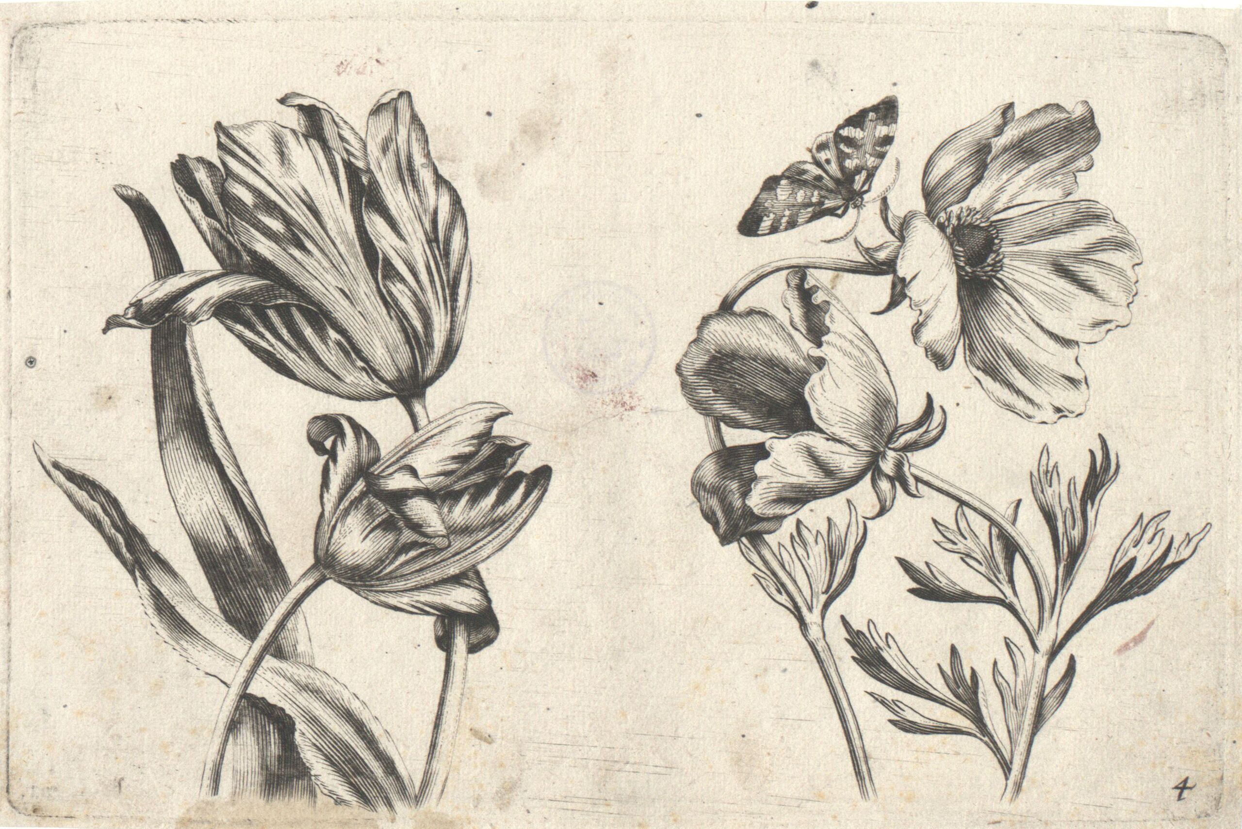 - Zwei verschiedene Blumen, Blatt 4 aus einer Folge von Nachstichen nach de la Fleurs „Giardino di Fiori“, herausgegeben von Jacob Sandrart, Verlagsnummer 23 (vom Bearbeiter vergebener Titel)