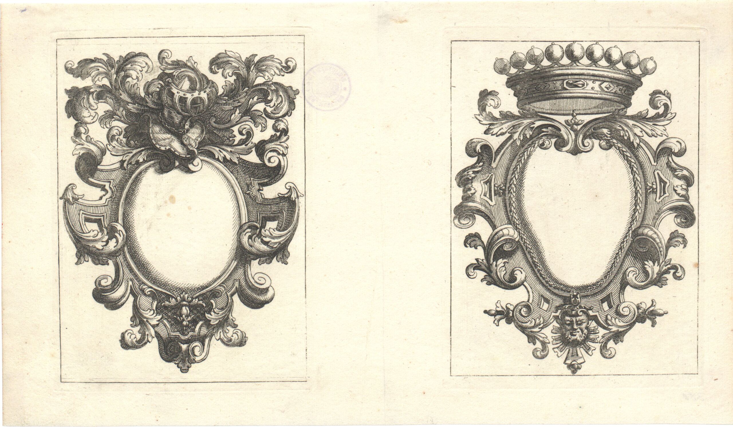 Zwei Kupferstiche der Folge No 89 der seitenverkehrtenKopie herausgegeben durch Weigel nach Blatt 2 und 1 der Originalfolge von Jean Du Vivier, [Second Livre de Cartouches Pour Ornemens des Armes], herausgegeben durch François II de Poilly in Paris o. Jh., nach 1712 (Guilmard 1880, S. 123; Foulc 1914, 216; Lotz 1939, 368).