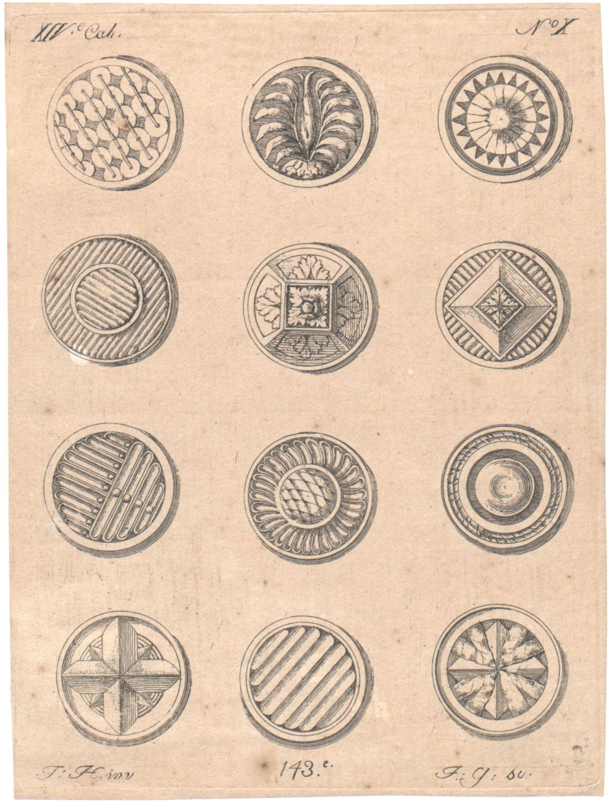 - Zwölf verzierte Knöpfe, Blatt 10 (fortlaufende Nummer 143) aus dem 14. Teil der Folge „Nouveaux Desseins de Differens Ornemens de Meubles.“ (vom Bearbeiter vergebener Titel)