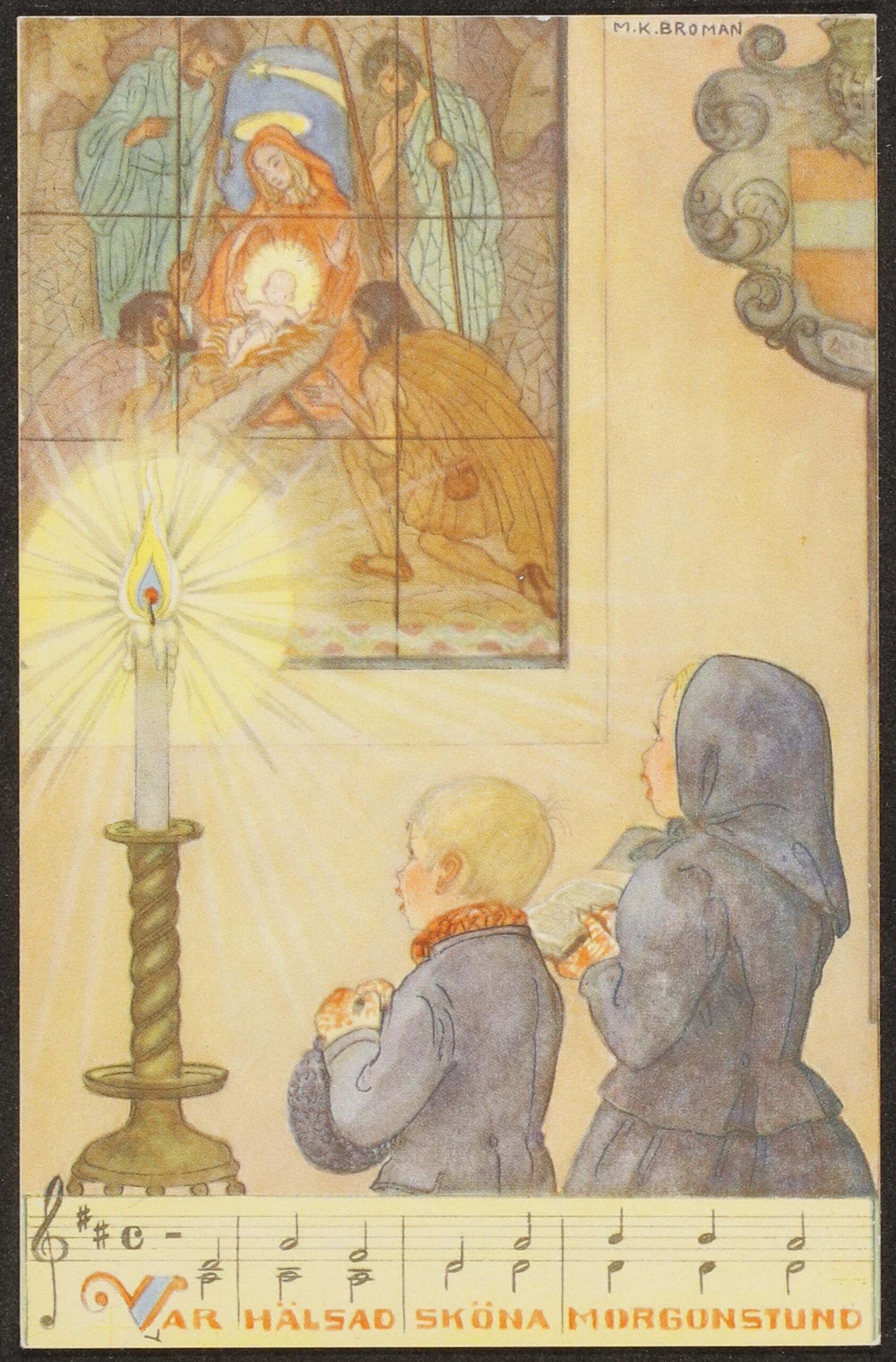 postcard, 2 singende Kinder vor einer Krippendarstellung, Mela Köhler-Broman, MAK Inv.nr. KI 23507-20