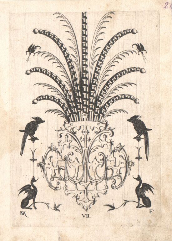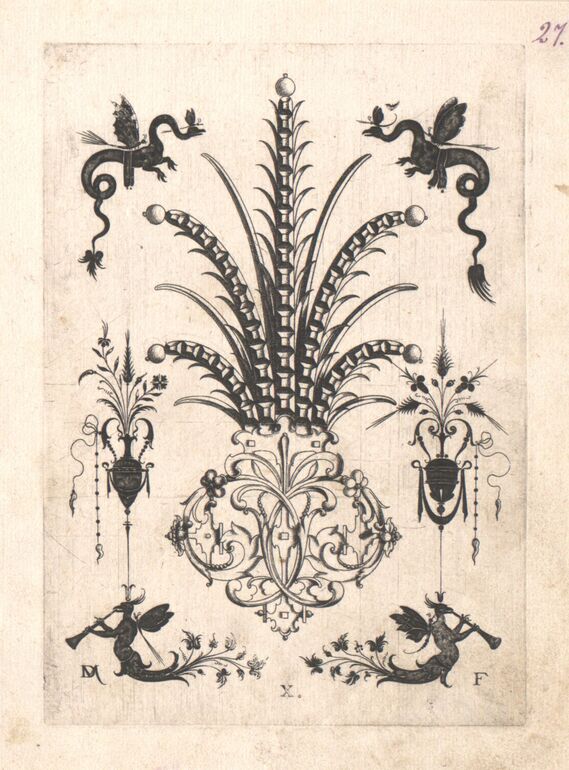ornamental engraving, Agraffe, umgeben von silhouettierten grotesken Figuren, Blatt 5 (V) aus einer Folge von Goldschmiedearbeiten, Daniel Mignot, MAK Inv.nr. KI 636-1