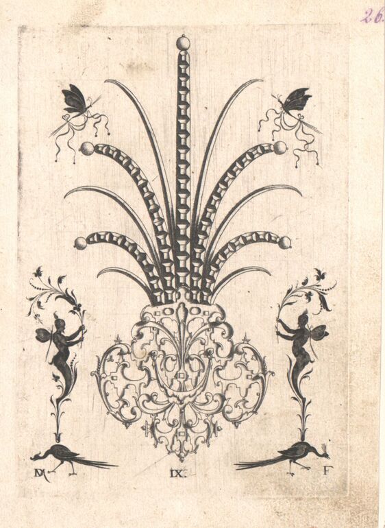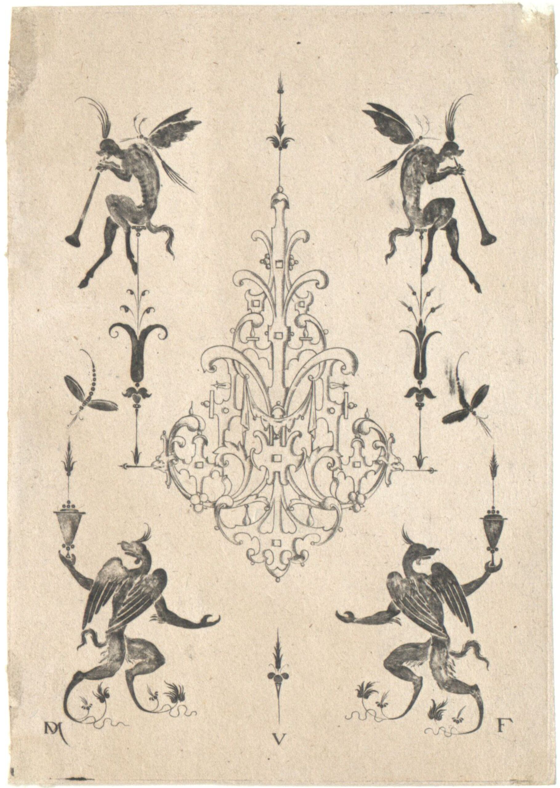 - Agraffe, umgeben von silhouettierten grotesken Figuren, Blatt 5 (V) aus einer Folge von Goldschmiedearbeiten (given title)