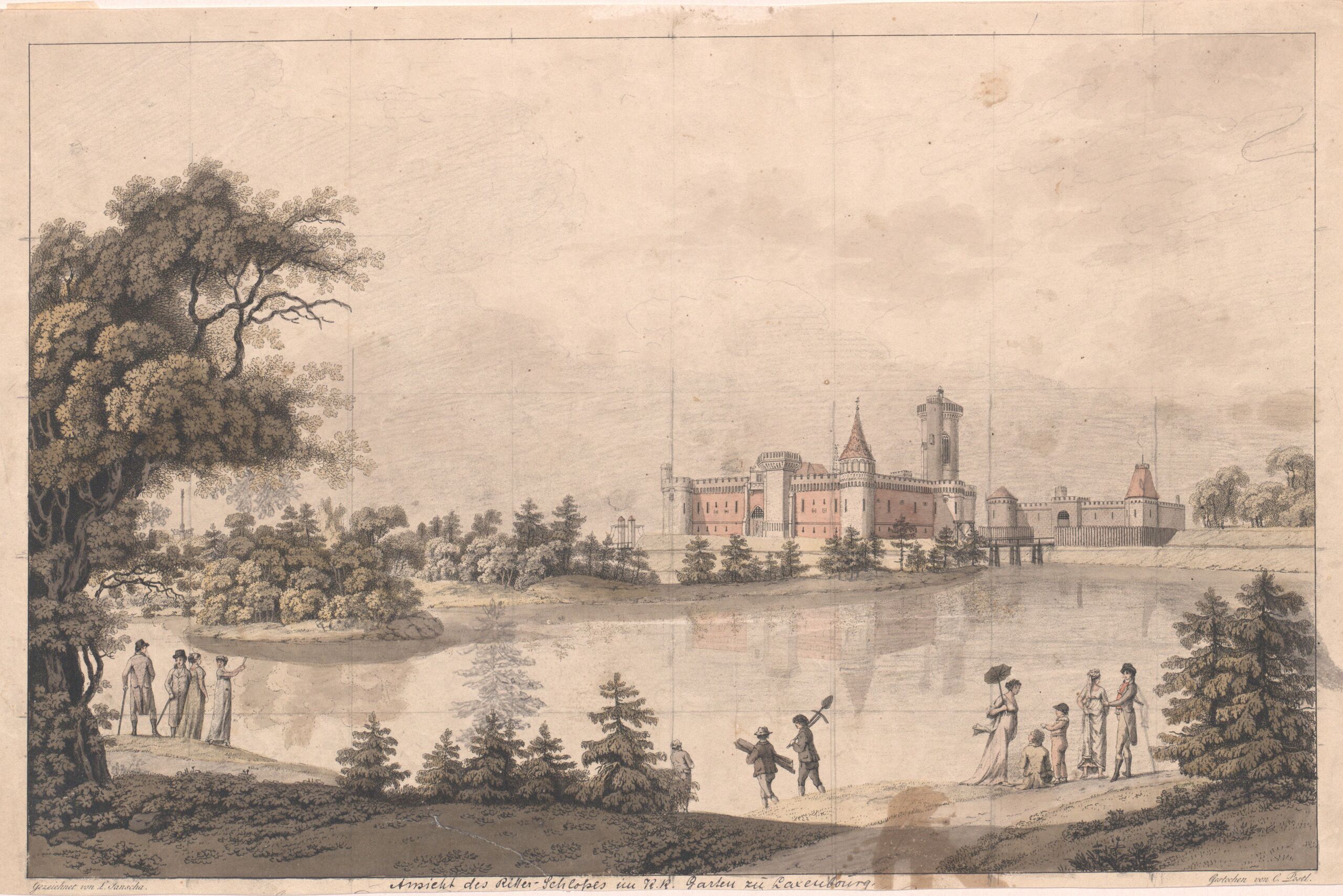 - text on object: Gezeichnet von L. Janscha, Gestochen von C. Postl / [handschriftlich:] Ansicht des Ritter- Schlosses im K. K. Garten zu Laxenbourg