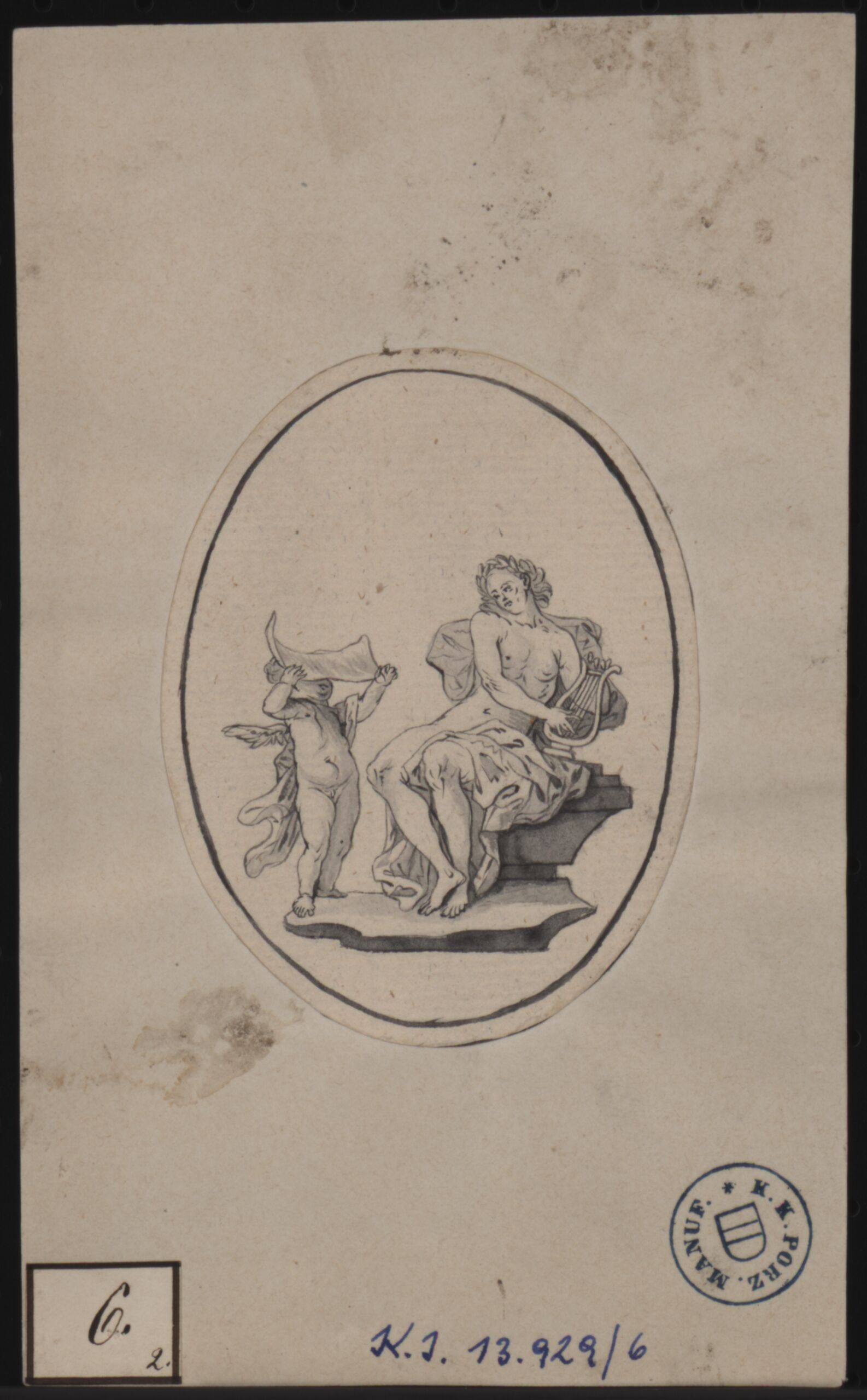 ovales Bild mit männlicher Figur in antikem Gewand, Lorbeerkranz und Leier, auf einem Postament sitzend, vor ihm ein geflügelter Putto, der ihm ein Spruchband hält