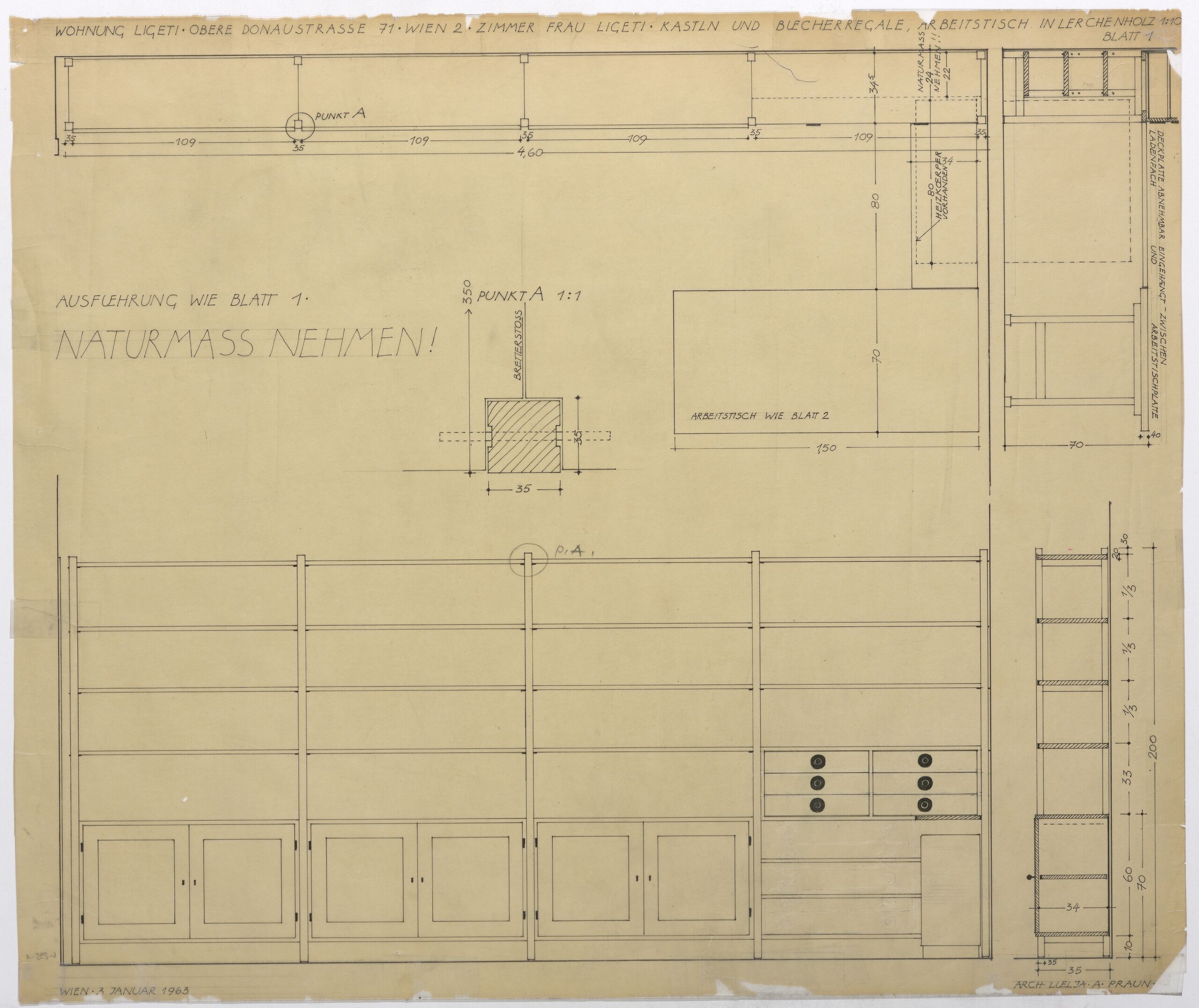 - text on object (oben) : WOHNUNG LIGETI OBERE DONAUSTRASSE 71 WIEN 2 ZIMMER FRAU LIGETI KASTLN UND BUECHERREGALE, ARBEITSTISCH IN LERCHENHOLZ 1:10 / BLATT 1