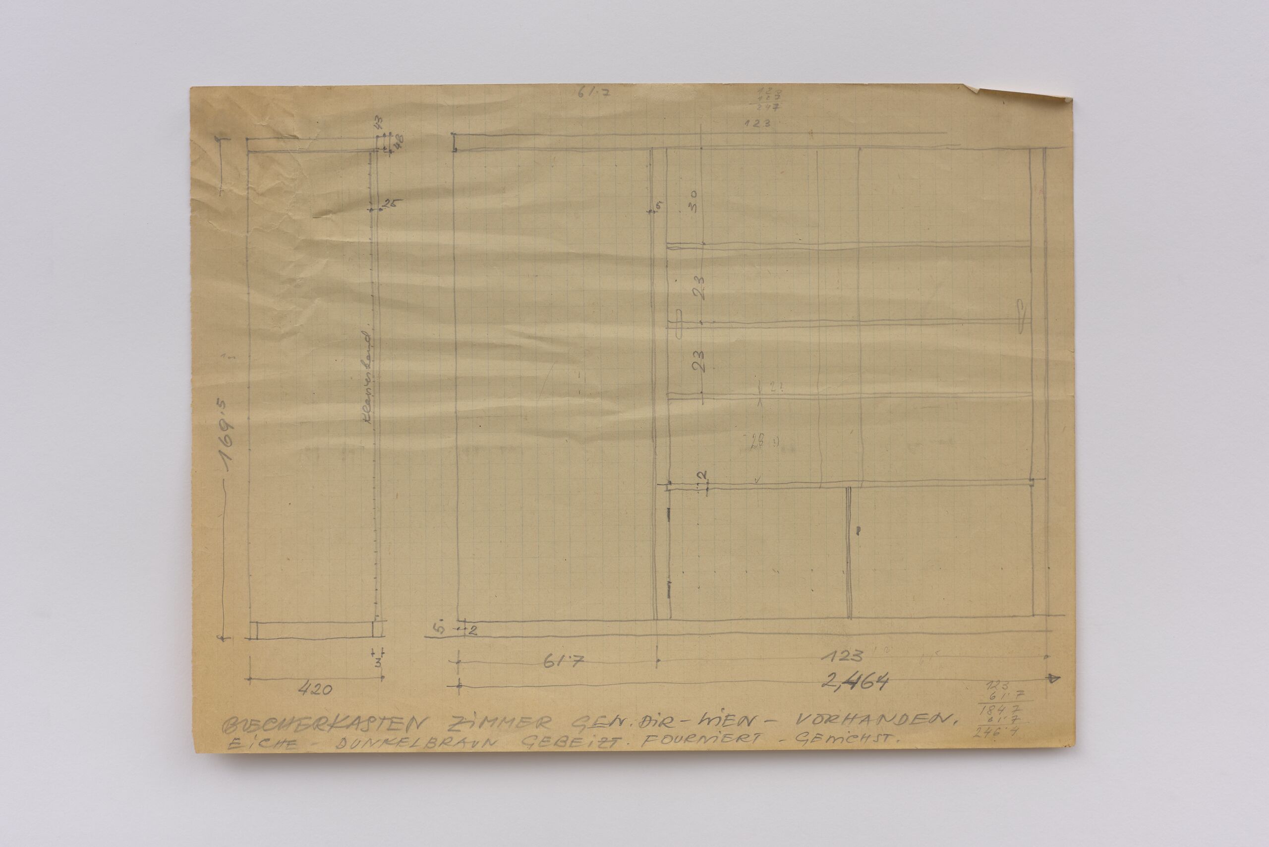 sketch, Aufriss und Querschnitt eines Bücherkastens im Arbeitszimmer des Generaldirektors, Anna-Lülja Praun, MAK Inv.nr. KI 16475-4-8