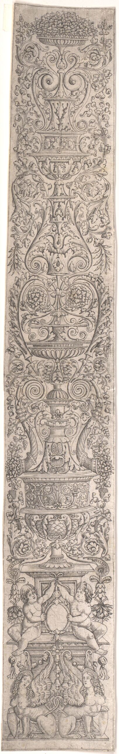 - Aufsteigendes Ornament. Unten zwei Sphinxen, Miller schreibt die Stiche Giovanni Pietro da Birago und Giovanni Antonio da Brescia zu, traditionellerweise wurde das Monogramm ZA mit “Zoan Andrea inv.” identifiziert (given title)