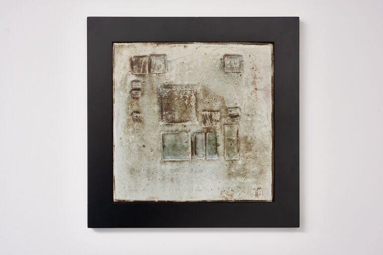 Kachel, quadratisch, mit zum Teil naturfärbig glasierten Profilköpfen römischer Kaiser und Kaiserinnen in runden von weiß-blaugelben Akanthusblattkränzen umrahmten Medaillons auf grünem Fond. Die Ecken des Quadrates füllen stilisierte Lilien. Im Medaillon ein Frauenkopf (Aurelia) nach links mit vergoldeten, von einer Perlenschnur durchzogenen Haaren, von denen einzelne Strähnen niederflattern, unter einer phantasiereich geformten blauen Haube mit Schläfenschildchen. Der blaue Mantel ist links geknüpft. Wangen und Hals sind in Fleischfarbe leicht getönt