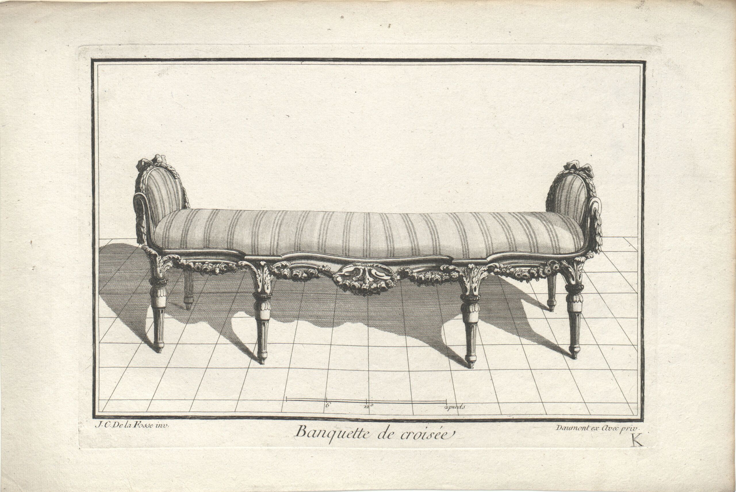 - text on object: Banquette de croisée / J. C. De la Fosse inv., Daumont ex. Avec priv. / K