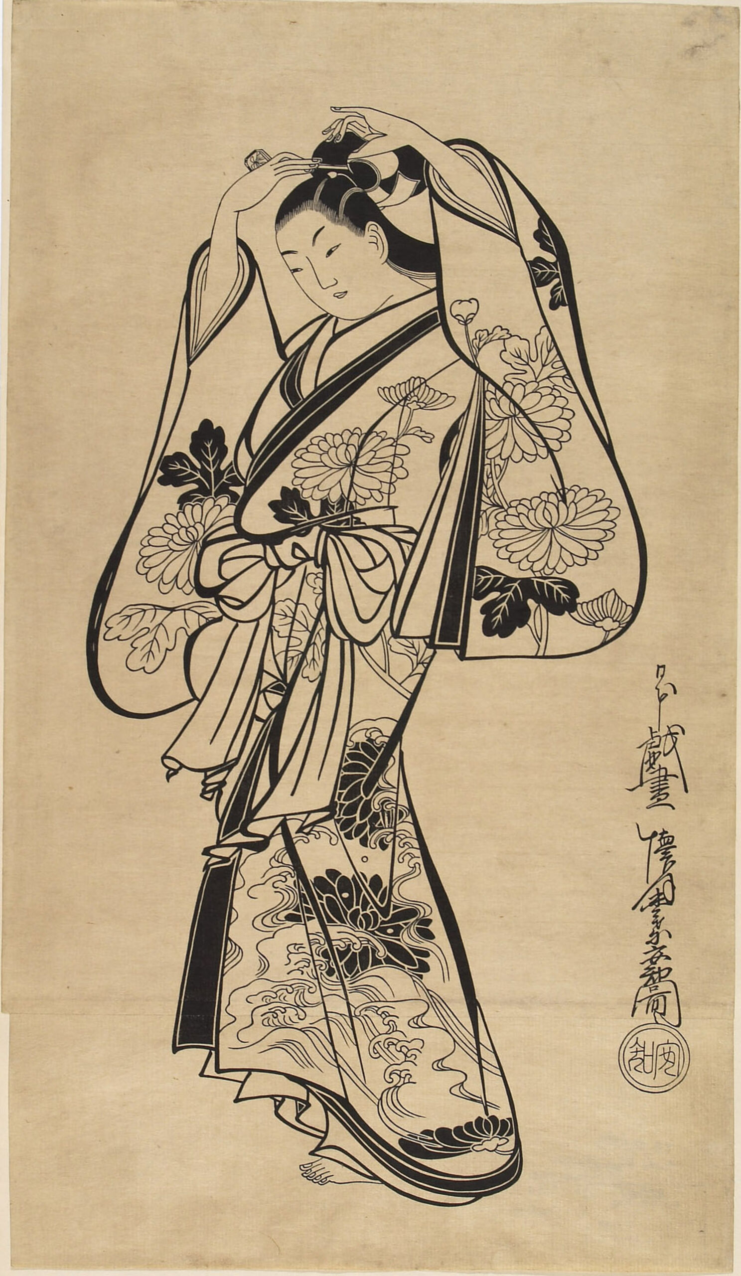 Eine Frau steckt sich eine Haarnadel in ihre Haare. Der Kimono ist in der oberen Hälfte mit weißen Chrysanthemen und in der unteren Hälfte mit schwarzen Chrysanthemen verziert, die in einen wilden Fluss fallen. Unten wurde ein zweites Stück Papier angeklebt. Das Bild ist ein Neudruck wahrscheinlich aus der Meiji-Zeit, die erste Auflage entstand Anfang des 18. Jahrhunderts. Lane datiert die erste Auflage auf nach 1710 (vgl. Lit.). Bei diesem Nachdruck wurde darauf geachtet, dass auch das Papierformat der Zeit des Originals entspricht. Dabei wurde an ein Großformat ein kleinerer Streifen angestückelt, was ein Länge von 55 bis 65 cm ergab. Das Format wurde bis ca. 1720 verwendet.