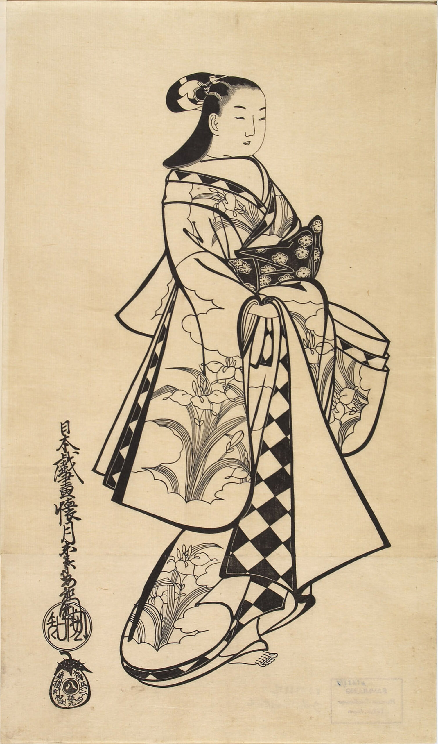 Nihon giga Kaigetsudō Anchi zu 日本戯畫懐月堂安知圖 Eine Frau mit einem Unterkimono in Schachbrettmuster. Der Kimono selbst ist mit Schwertlilien zwischen Wolken verziert. Laut Gunsaulus ist der Verleger ein gewisser Santaya Kihachi von Maruya und das Erscheinungsdatum der 1. Auflage ist ca. 1714 (vgl. Lit.). Bei diesem Nachdruck wurde darauf geachtet, dass auch das Papierformat der Zeit des Originals entspricht. Dabei wurde an ein Großformat ein kleinerer Streifen angestückelt, was ein Länge von 55 bis 65 cm ergab. Das Format wurde bis ca. 1720 verwendet.