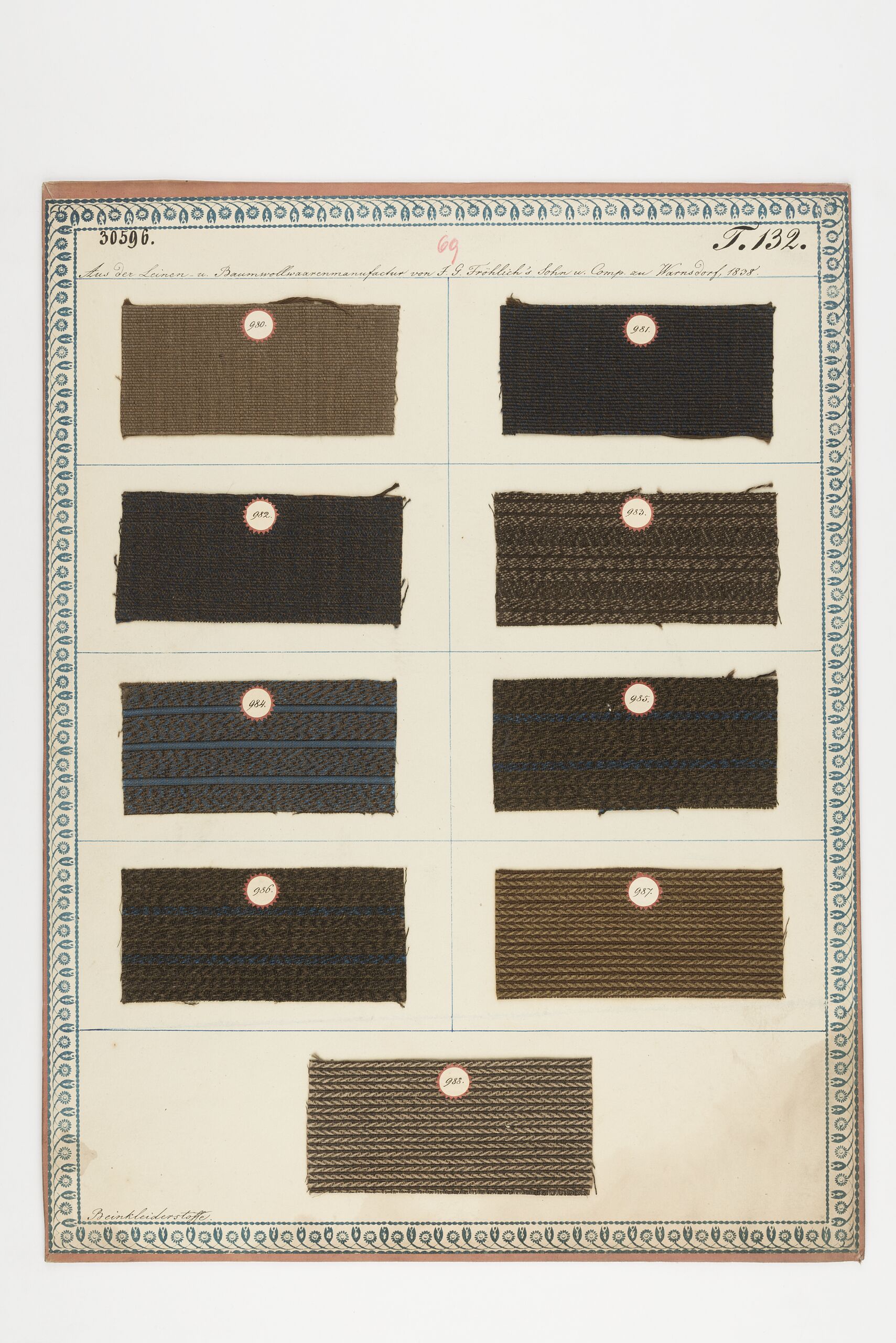 - label (front) : Aus der Leinen- u. Baumwollwaarenmanufactur von I. G. Fröhlich's Sohn u. Comp. zu Warensdorf, 1838. / Beinkleiderstoffe.