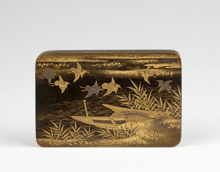 Serie von Diptychen zu den 54 Kapiteln des Romans „Genji monogatari 源氏物語“ (Erzählung vom Prinzen Genji) mit einem Hintergrund in Blinddruck und (gedrucktem) Glimmereffekt. Hier der linke Teil des Diptychon für das 46. Kapitel „Shiigamoto 椎本“ (vgl. KI 7627-170). Ein Samurai sitzt auf dem Boden vor einem Stellschirm und blickt zu einer Frau auf, deren Kimono er mit einem Fächer festzuhalten versucht. Der Stellschirm zieht sich über beide Teile des Diptychons und zeigt eine Winterlandschaft mit zwei Mandarinenten in einem See, wobei das Männchen im linken und das Weibchen im rechten Teil des Diptychon platziert wurde. Da Mandarinenten für Liebe und Treue stehen (ein Pärchen bleibt ein Leben lang zusammen), sollen sie wohl die Liebe zwischen den beiden Protagonisten im Vordergrund symbolisieren. Die Stehlampe im Hintergrund wurde mit einem Kimono bedeckt.
