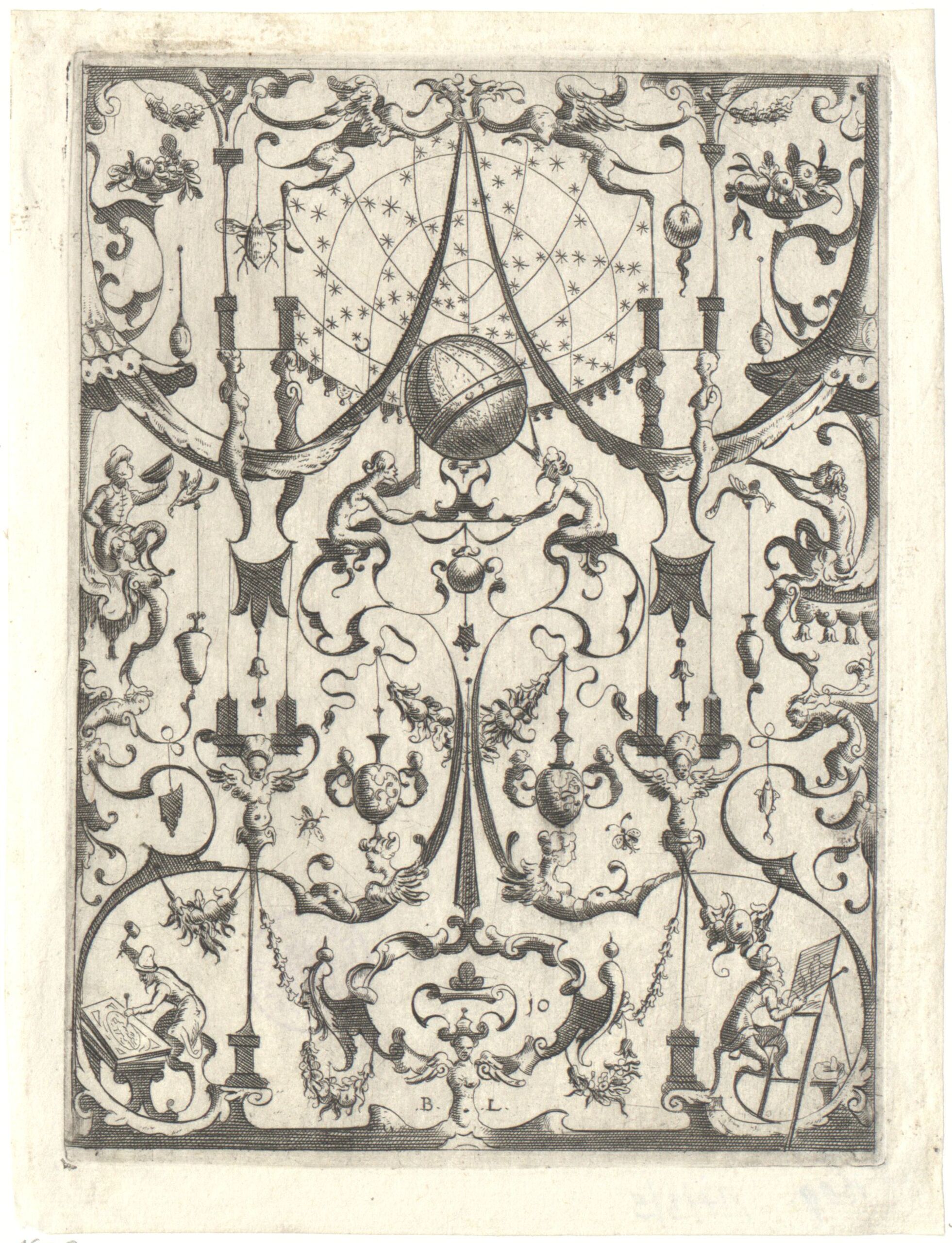 - Blatt 10 einer numerierten Folge von grotesken Wandfüllungen; seitenverkehrte Versionen von L. Kilians „Newes gradesca Büchlein“ (given title)