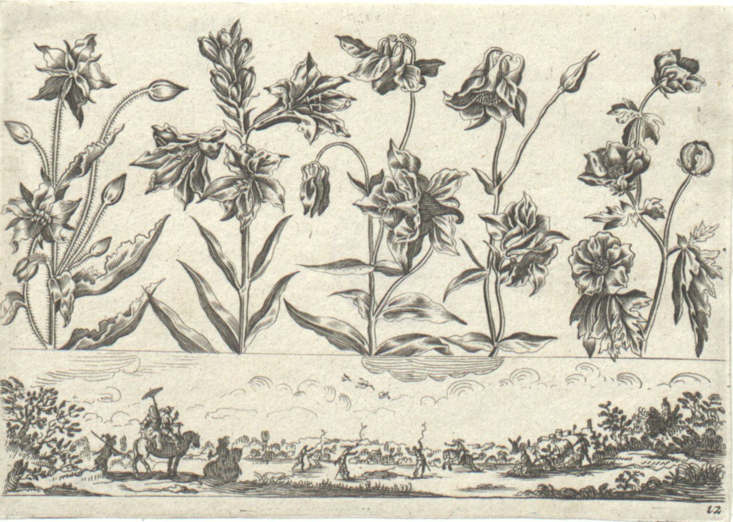 - Blatt 12 aus der Folge „Livre Nouveau de Fleurs tres util pour l‘ Art d‘ Orfevrerie, et autres“, Blumendarstellungen, darunter je eine Landschafts- oder Schlachtendarstellung, seitenverkehrte Kopien nach Nicolas Cochin, herausgegeben von N. Visscher (given title)