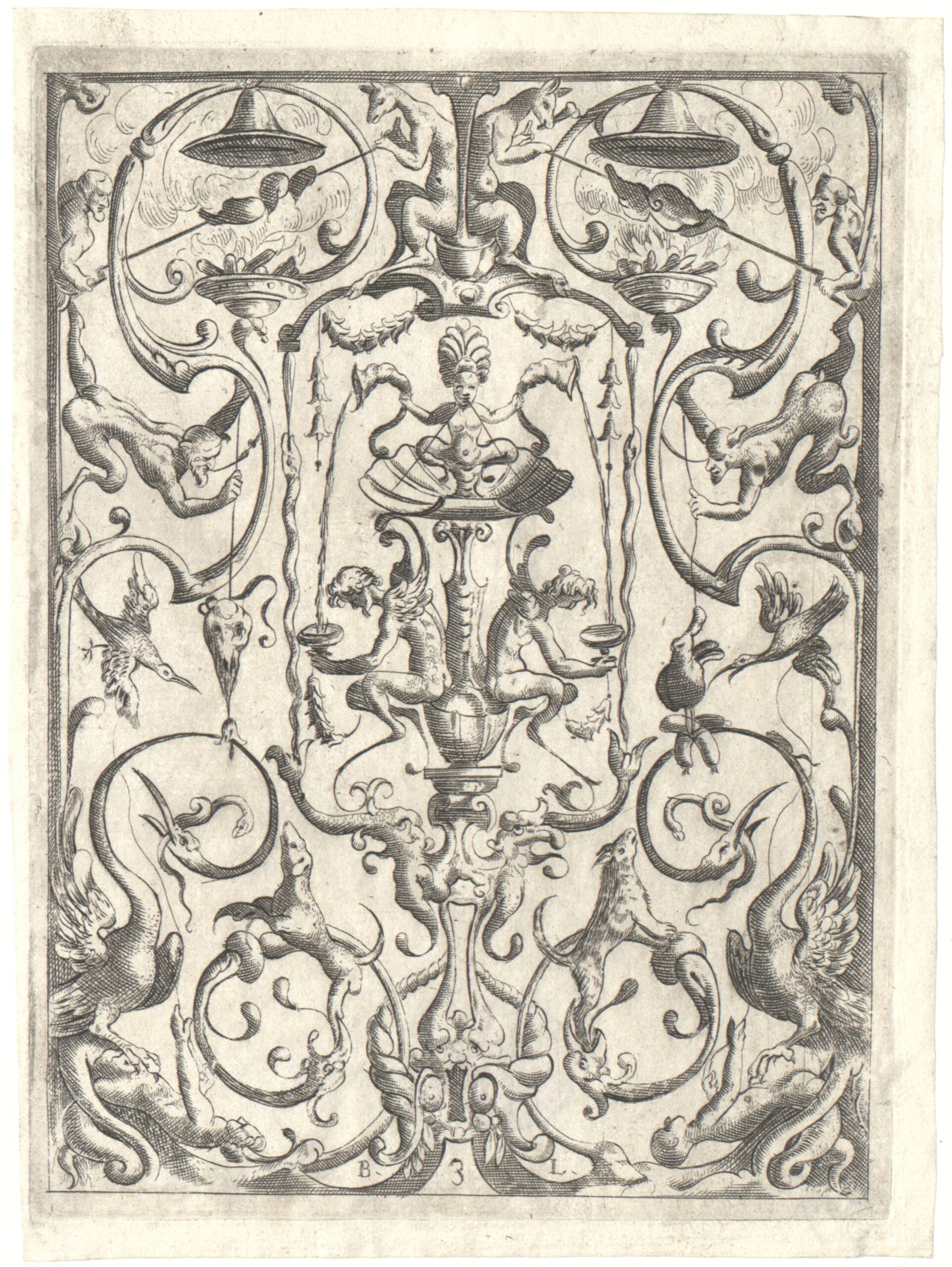 - ornamental engraving, Blatt 3 einer numerierten Folge von grotesken Wandfüllungen; seitenverkehrte Versionen von L. Kilians „Newes gradesca Büchlein“