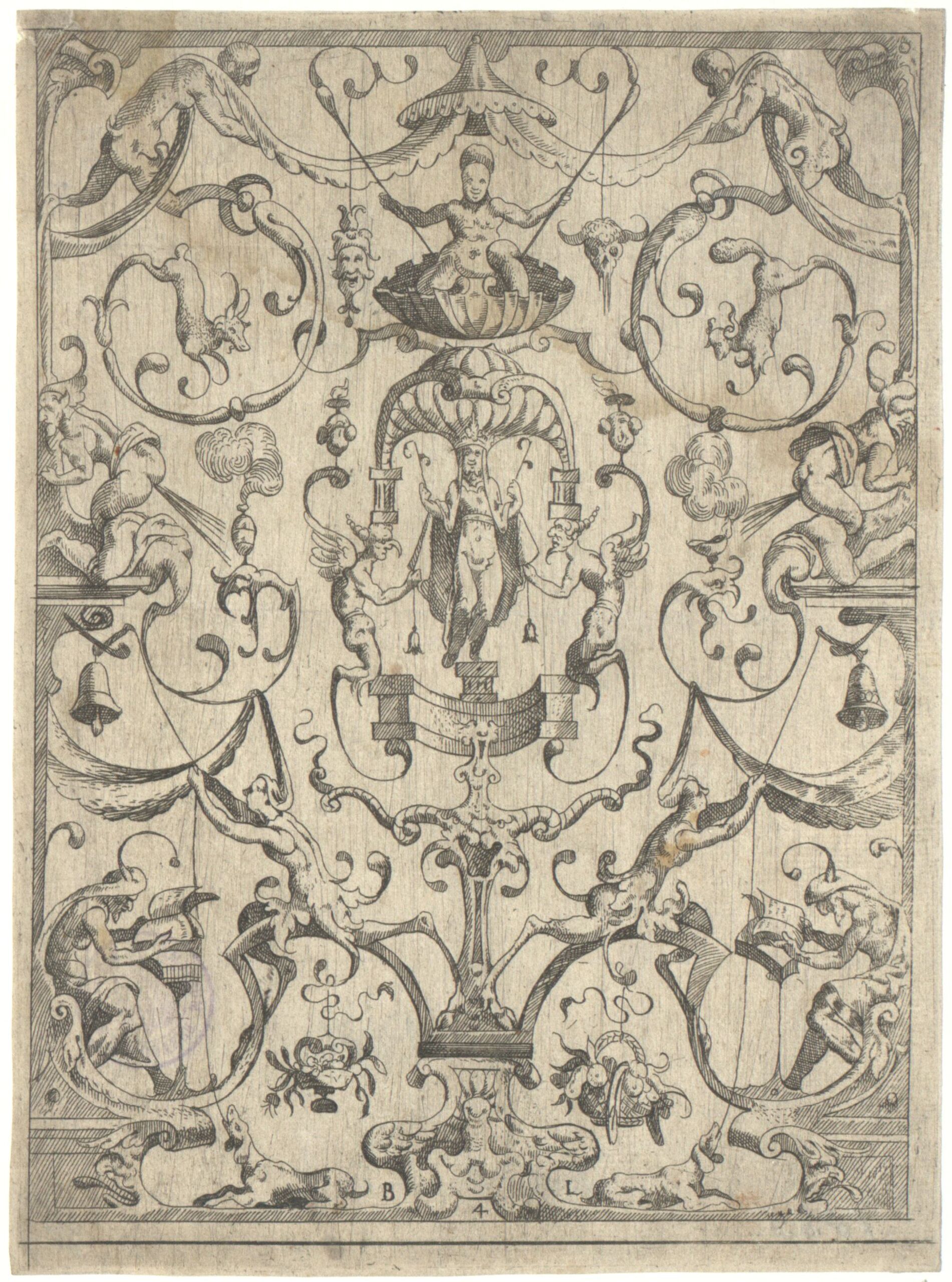 - Blatt 4 einer numerierten Folge von grotesken Wandfüllungen; seitenverkehrte Versionen von L. Kilians „Newes gradesca Büchlein“ (given title)