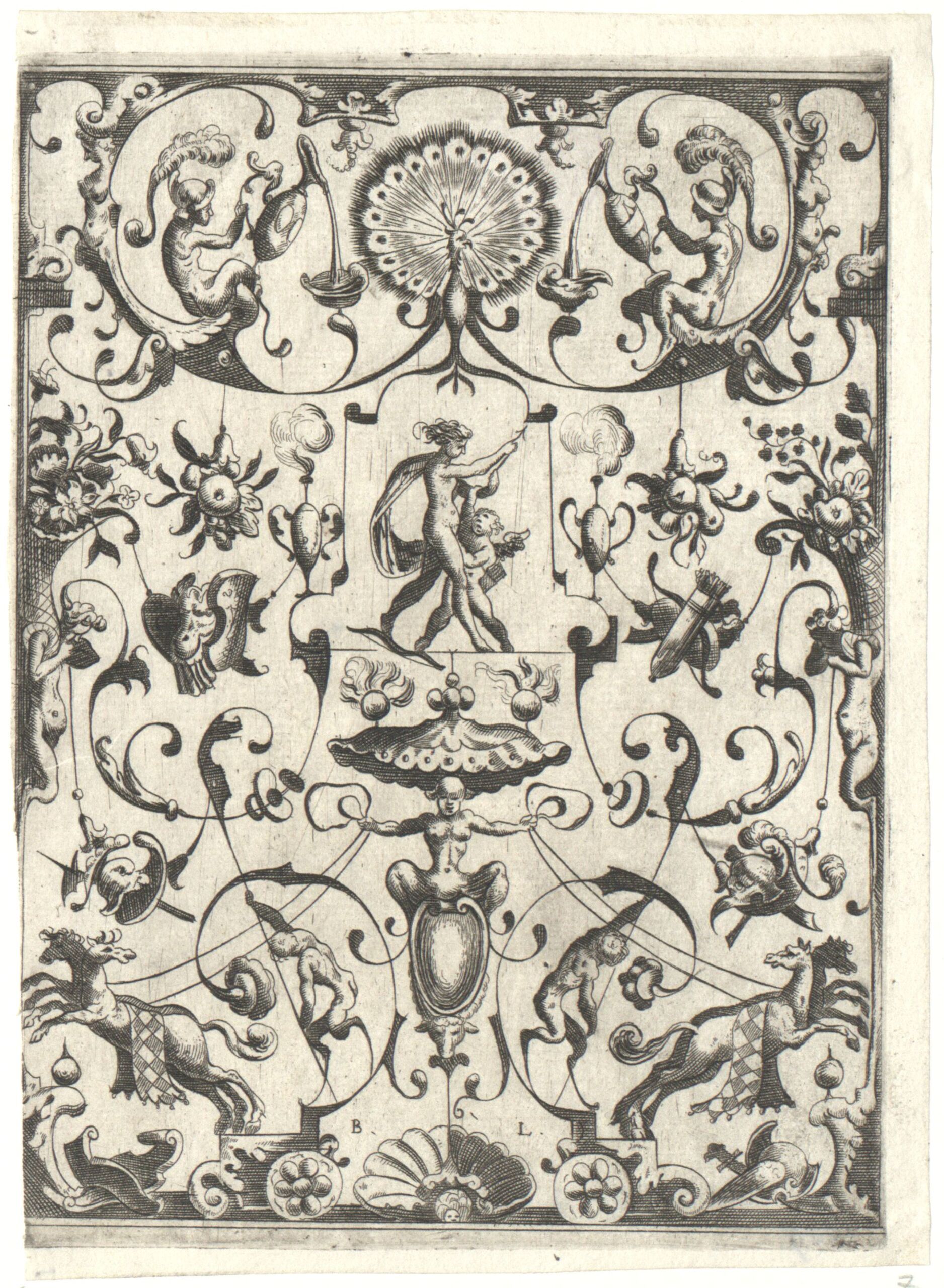 - ornamental engraving, Blatt 3 einer numerierten Folge von grotesken Wandfüllungen; seitenverkehrte Versionen von L. Kilians „Newes gradesca Büchlein“