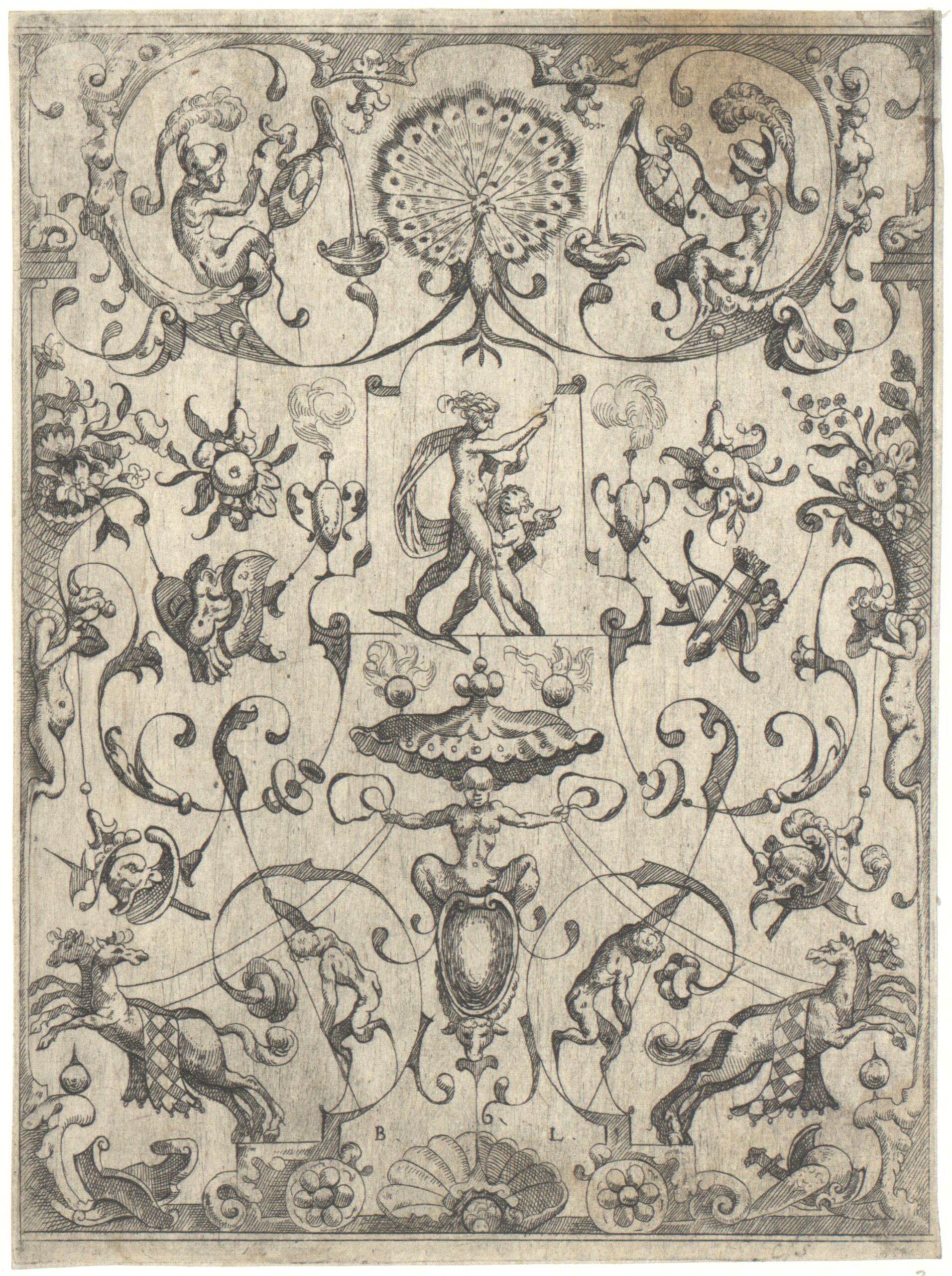 ornamental engraving, Blatt 6 einer numerierten Folge von grotesken Wandfüllungen; seitenverkehrte Versionen von L. Kilians „Newes gradesca Büchlein“, Monogrammist B L, MAK Inv.nr. KI 1085-1
