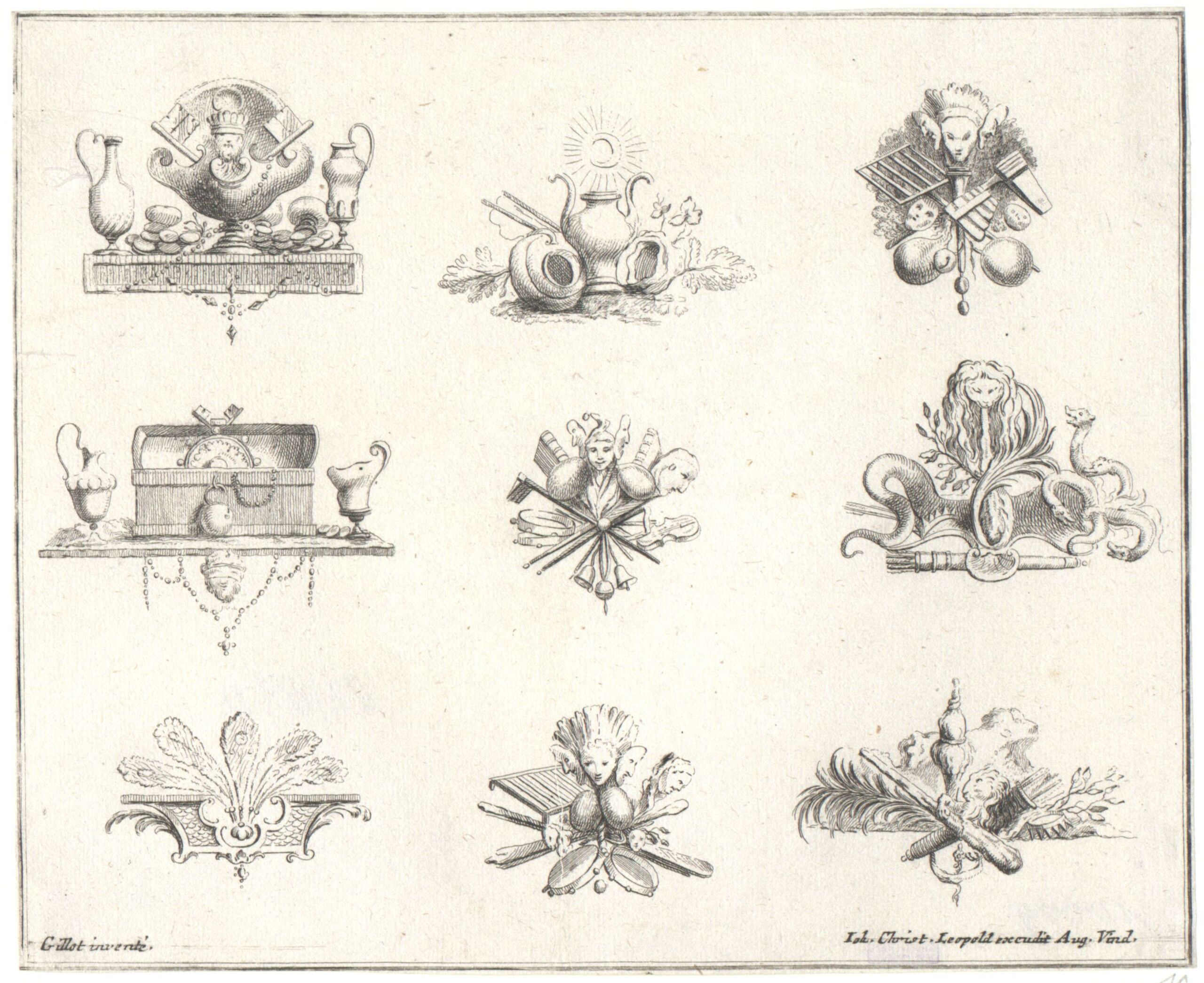 ornamental engraving, Blatt aus der Folge „Ornamenten- Büchlein. Von allerhand Kriegs-Signis, Lampen, und Sinnbildern etc.“, herausgegeben von J. C. Leopold, Claude Gillot, MAK Inv.nr. KI 10009-11