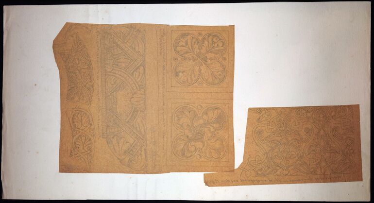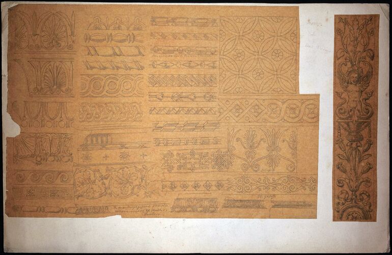 - Blatt mit einer Collage aus sieben aufkaschierten Pausen von Ornamenten und Deckengestaltungskonzepten (given title)