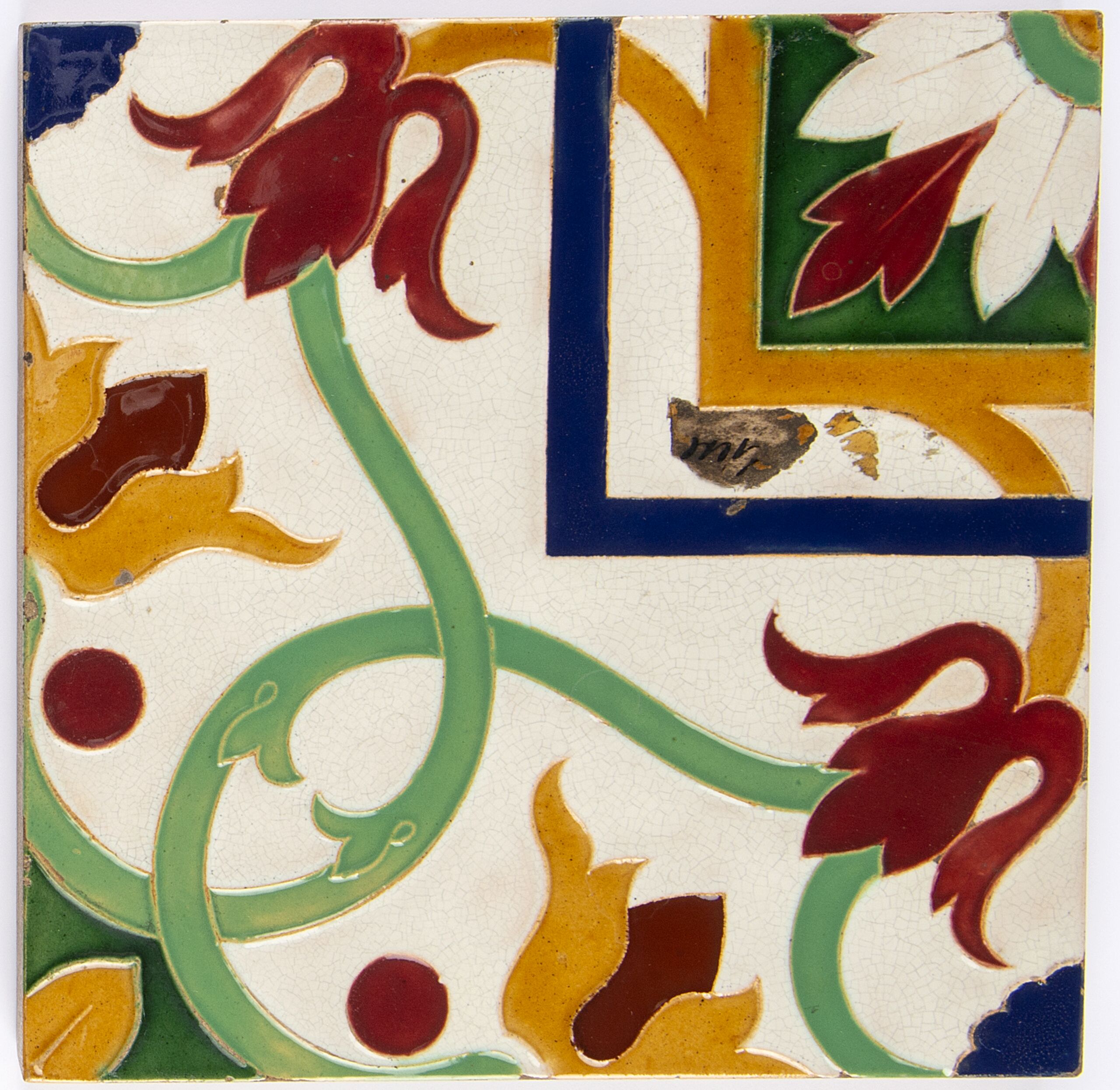 ein florales Ornament, dessen Motiv sich aus 4 Fliesen zusammensetzt: Zusammengefasst: Mitte weiße Blume, die quadratisch von blauen und grünen Bändern umrahmt, restliche Fläche von grünen Ranken mit roten und ockerfarbigen Blumen bedeckt, alle vor erhöhtem weißen Grund