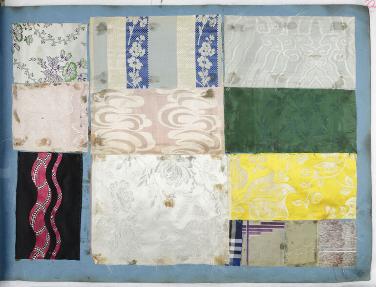 page of a pattern book, Blumenmuster (Kirchenstoff), Streifen, Karo, Streu- u. und orientalische Muster, Anton Martin, MAK Inv.nr. T 8175-39