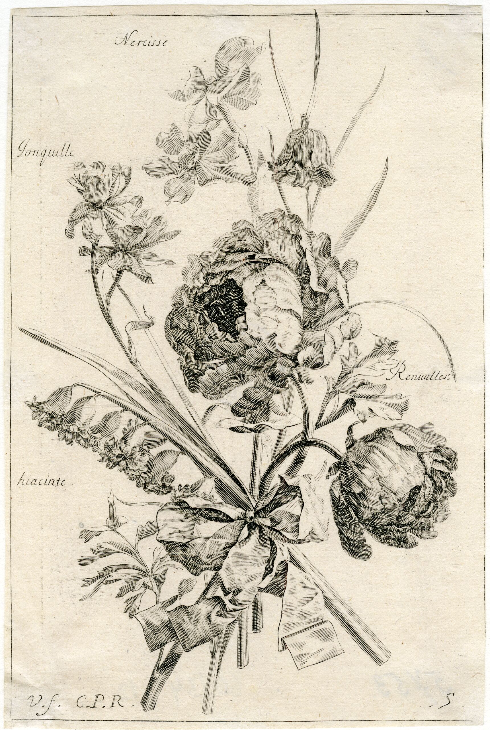 - text on object: Nercisse, Jonguille, Renunttes, hiacinte / V. f. C.P.R. / 5