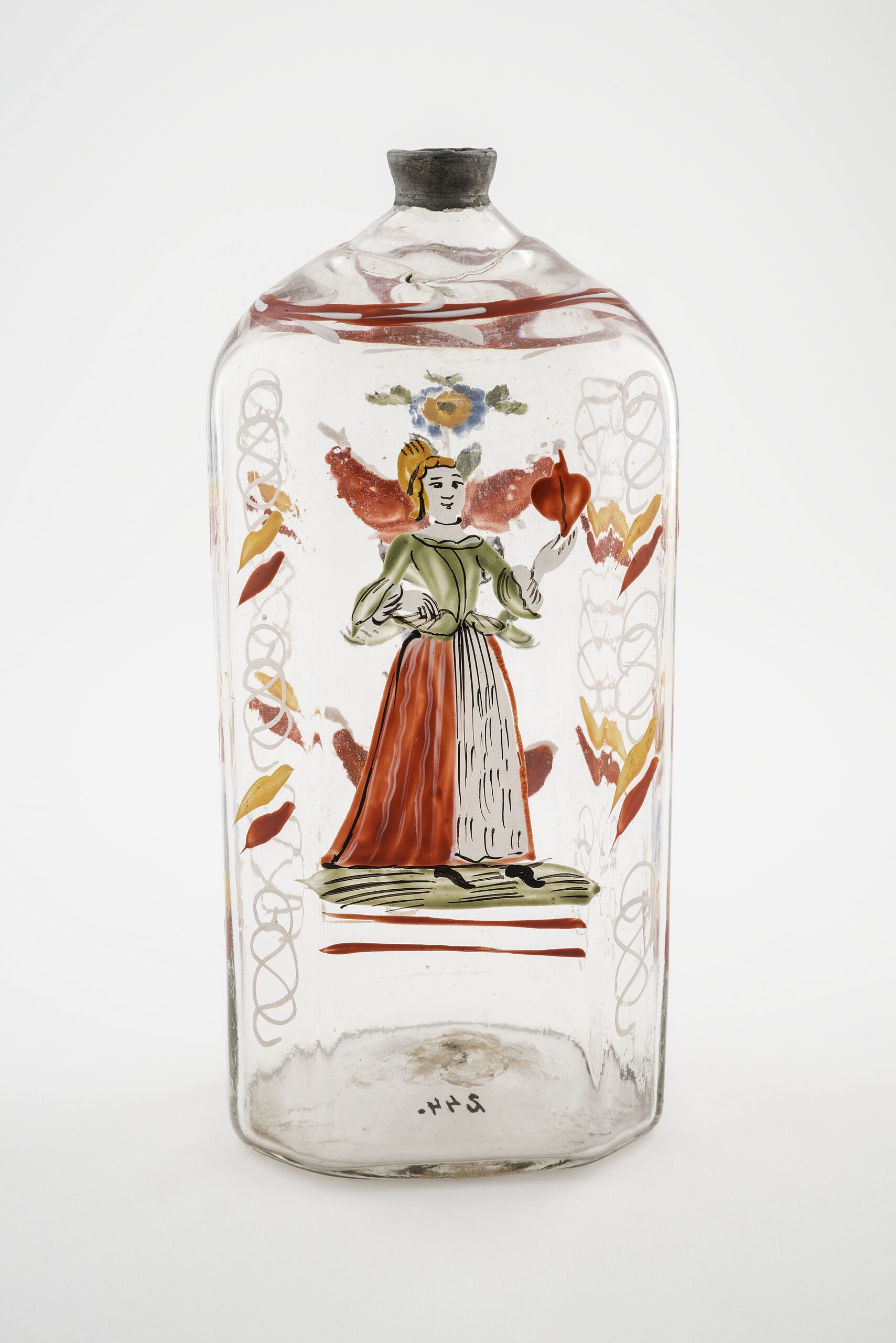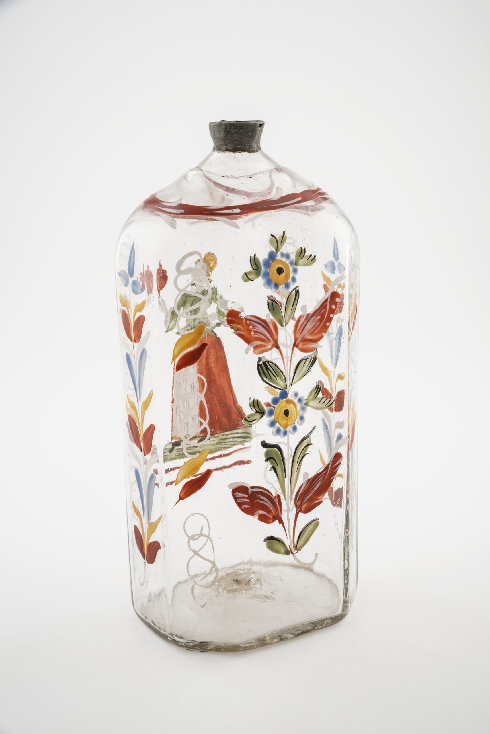 Achtseitige Flasche mit Zinnverschluß. Emailmalerei: Frau mit roten Kerzen in der Hand. Blütenstauden