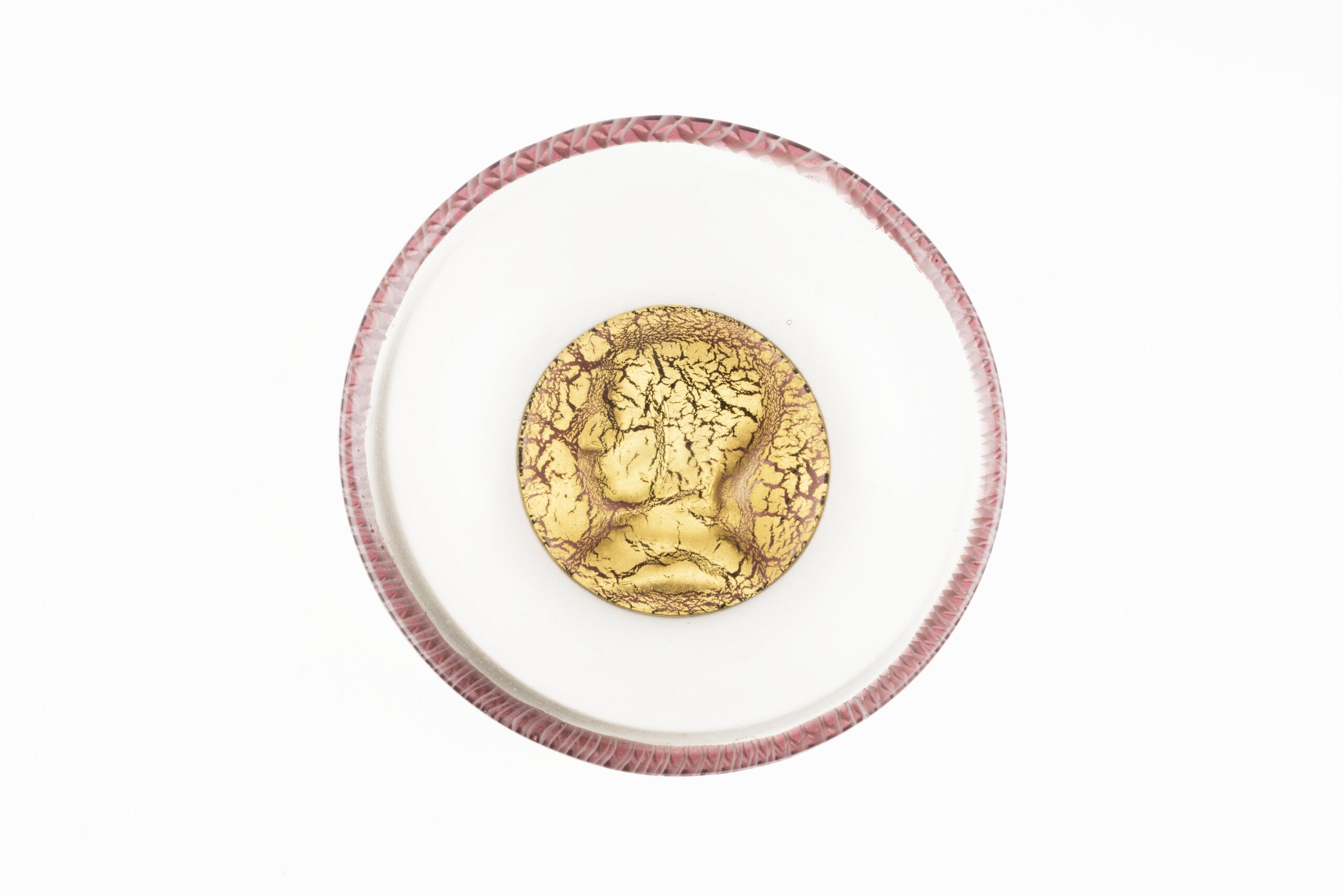 In der Mitte der Schale ein vergoldetes Reliefmedaillon von farblosem und violetten Glas überfangen, Rand violettes Glas mit weißem Glasfaden