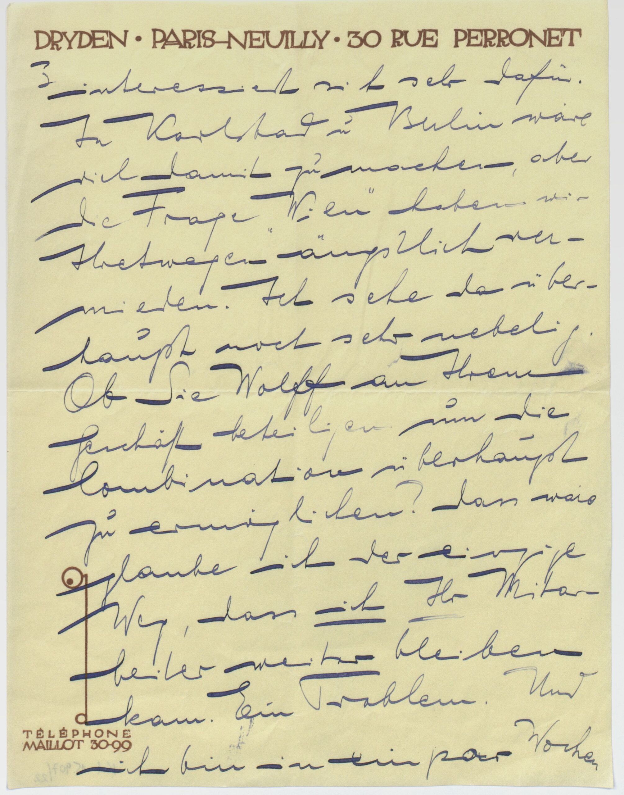 - handwriting: ... interessiert sich sehr dafür. In Karlsbad und Berlin wäre viel damit zu machen, aber die Frage „Wien“ haben wir Ihretwegen ängstlich vermieden. Ich sehe das überhaupt sehr nebelig. Ob Sie Wolff an Ihrem Geschäft beteiligen um die Kombination überhaupt zu ermöglichen? Dass wäre glaube ich der einzige Weg, dass ich Ihr Mitarbeiter weiter bleiben kann. Ein Problem. Und ich bin in ein paar Wochen ...