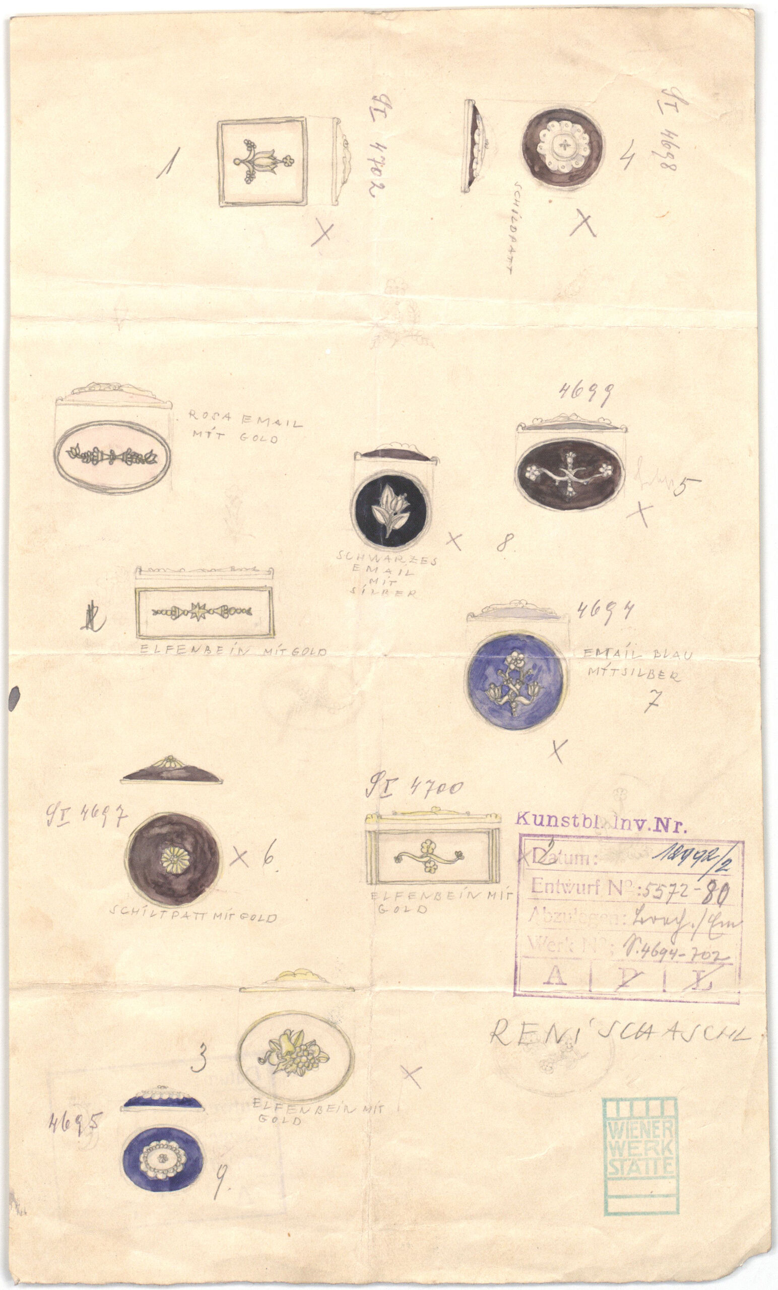- text on object: Email mit Gold, Email blau mit Silber, Schildpatt mit Gold, Elfenbein mit Gold”Signatur, Reni Schaschl